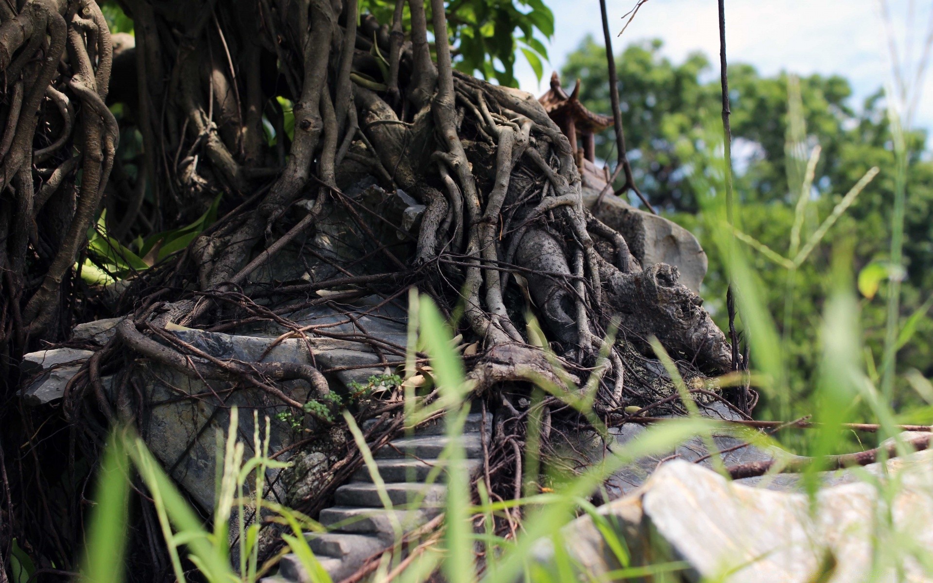 Tunnels de grottes baignées de soleil sur fond de forêt verte