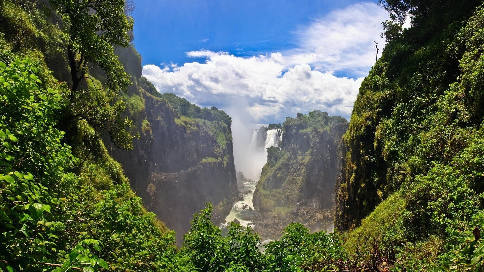 Cascade sur fond de montagnes, arc-en-ciel et arbres verts
