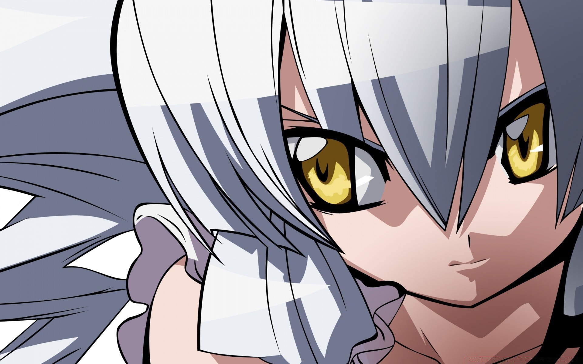 Visage de fille anime avec des cheveux blancs et des yeux jaunes gros plan