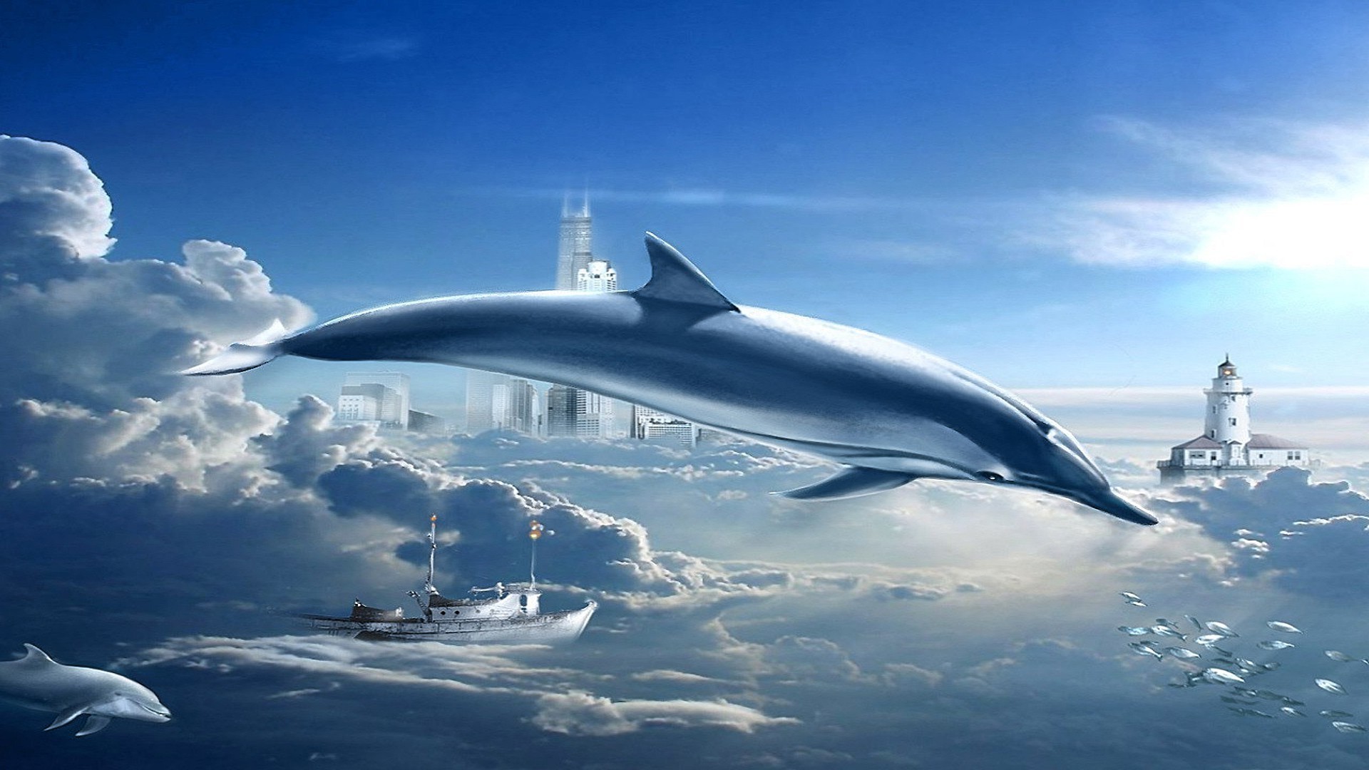 Dauphins dans le ciel avec des nuages. Fantasy. Brise-glaces