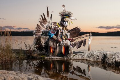 Un indien avec un corbeau sur la tête et un homme au masque noir
