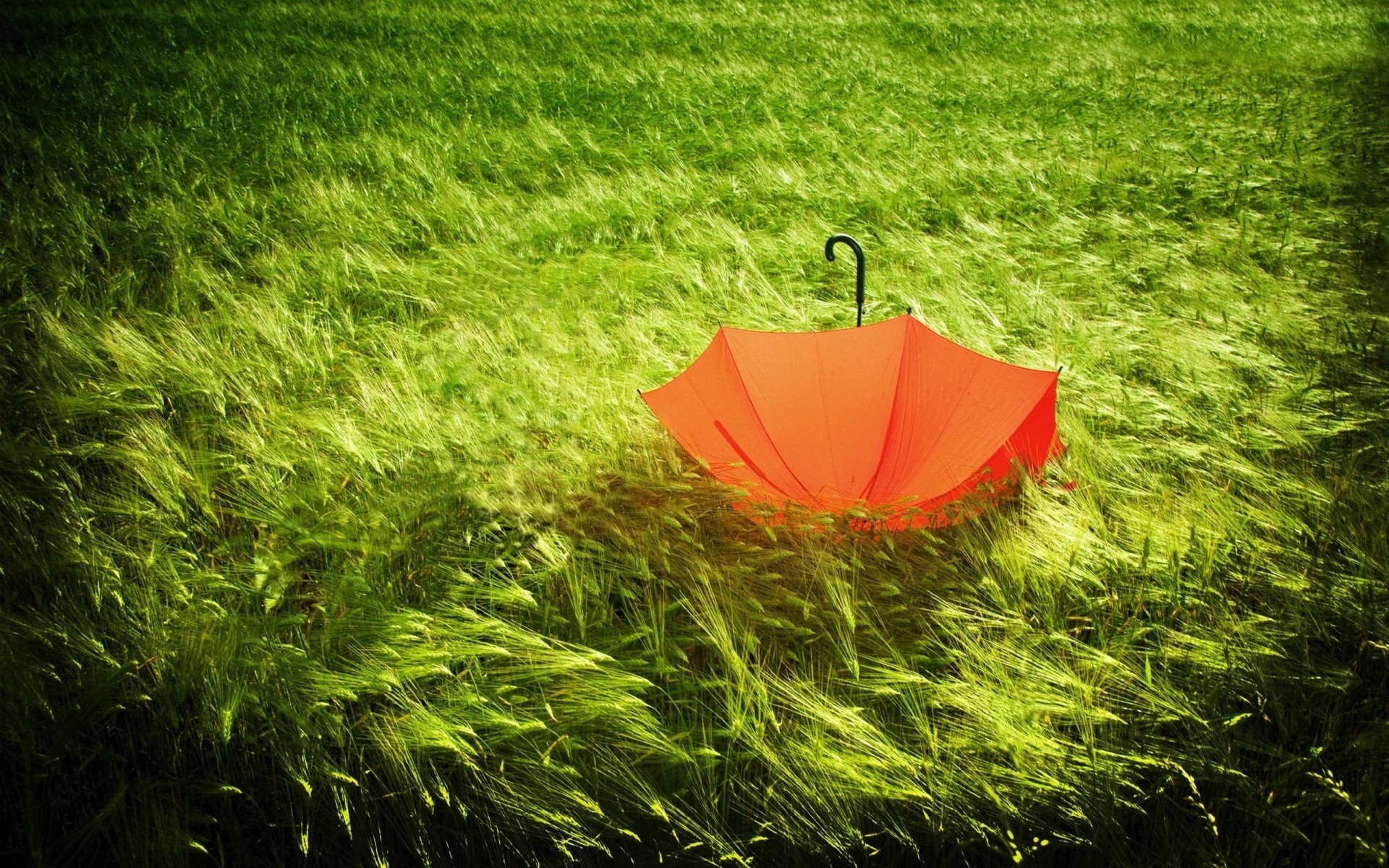 Parapluie orange se trouve dans la forêt sur l'herbe verte