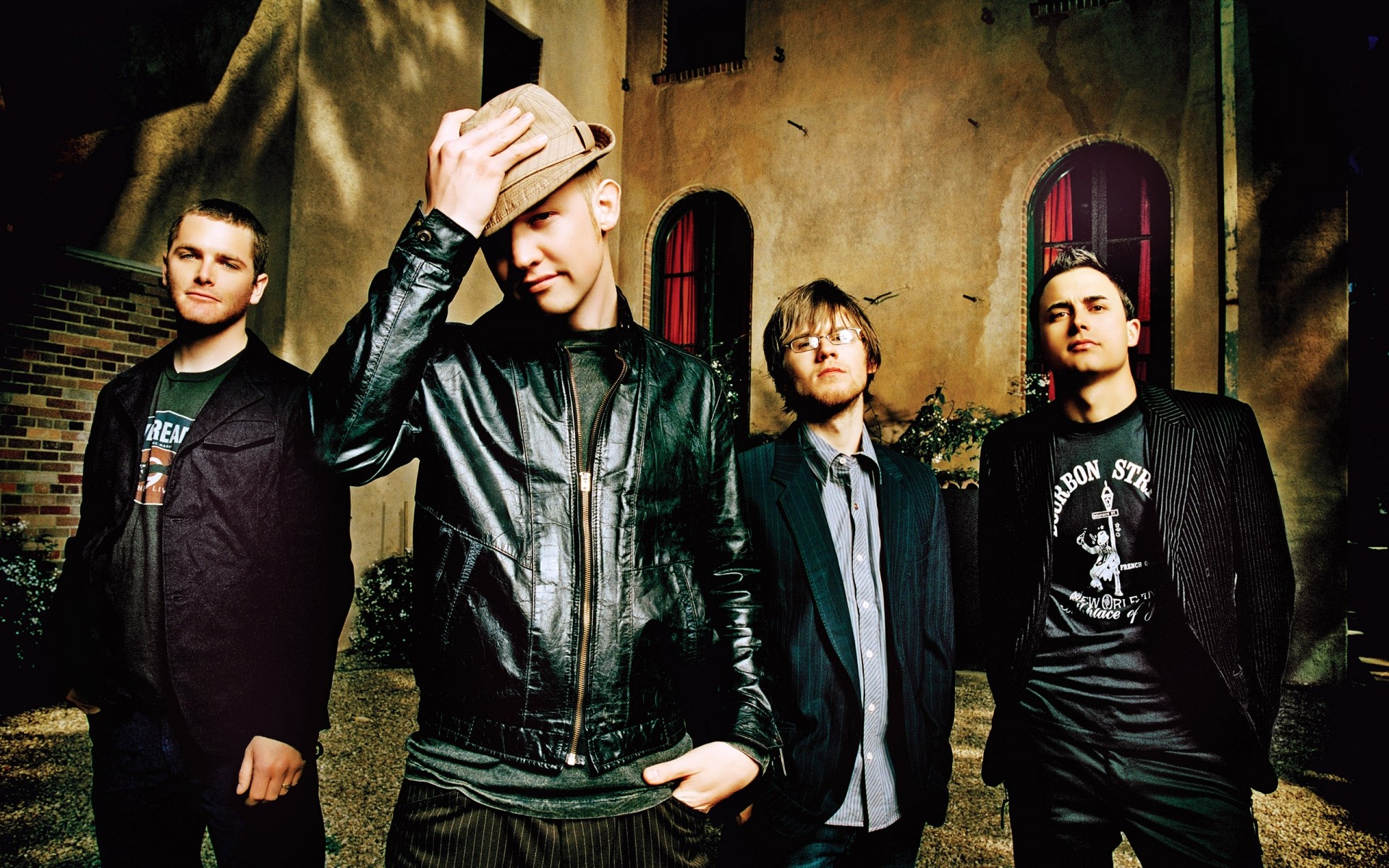 Groupe de jeunes hommes élégants près de la maison