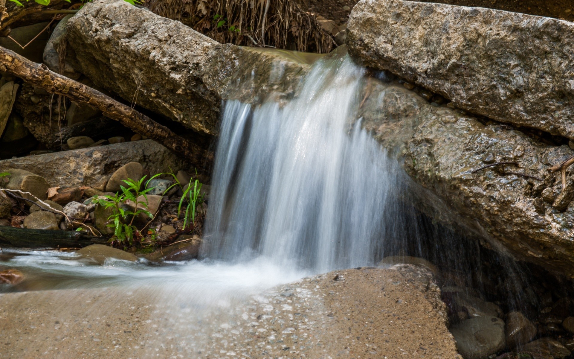 Cascade basse entourée de végétation verte
