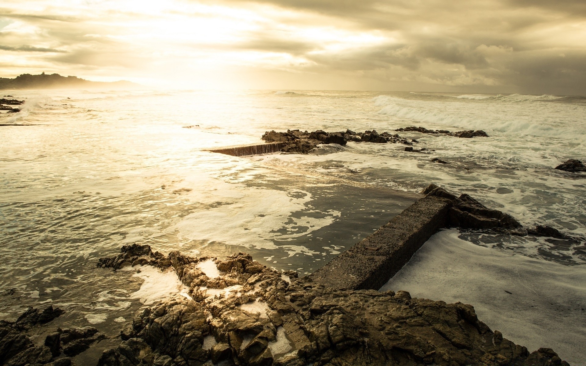 Image d'un pont tombé dans l'océan sur fond de coucher de soleil