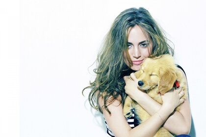 Portrait d une jeune fille avec un chiot mignon
