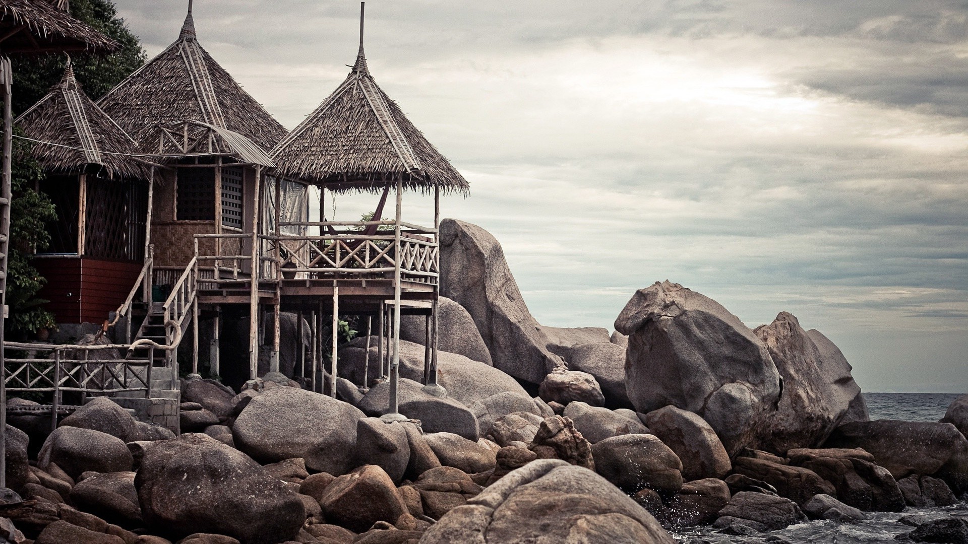 Paysage de huttes au bord de la mer
