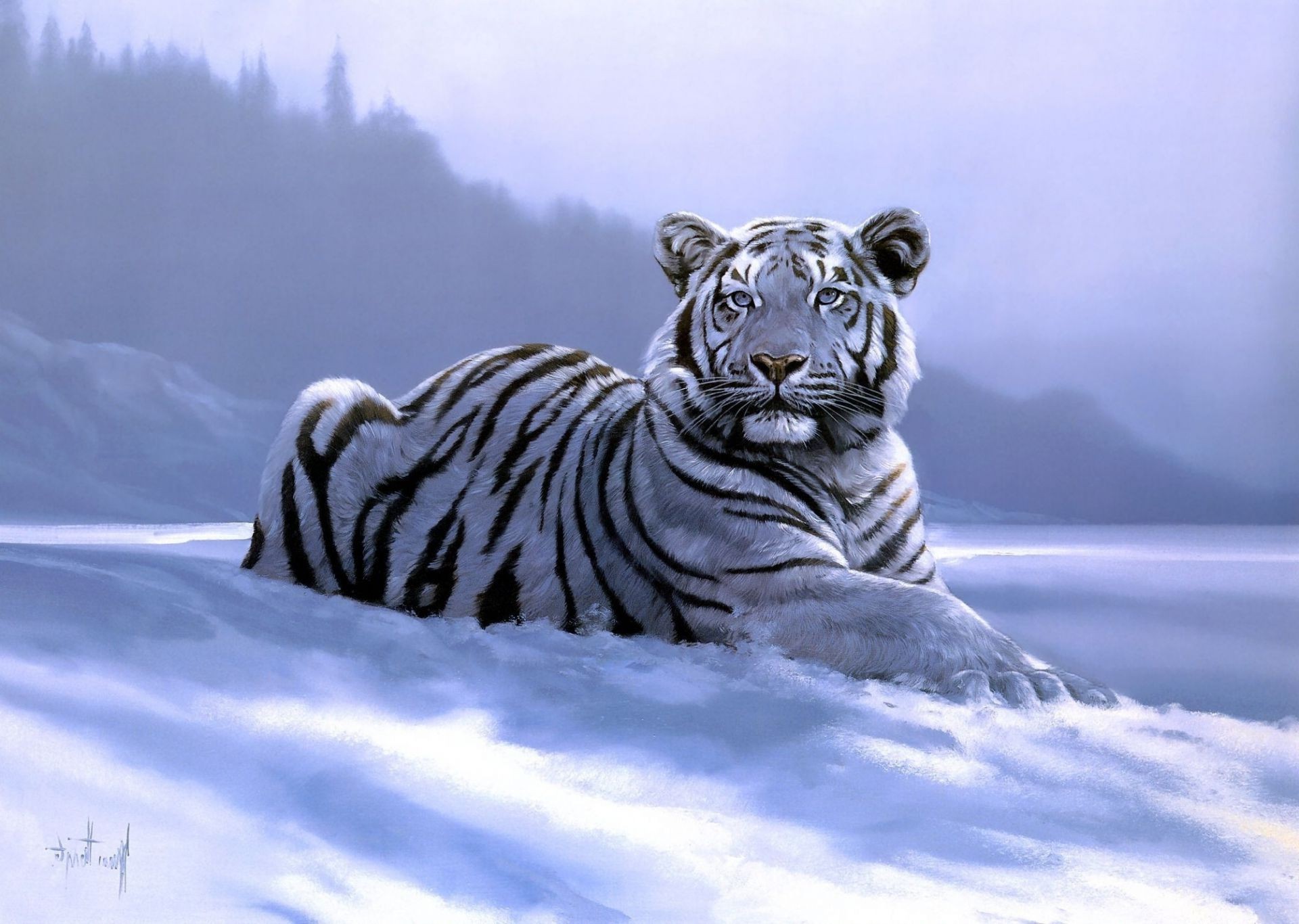 Tigre couché sur la neige froide