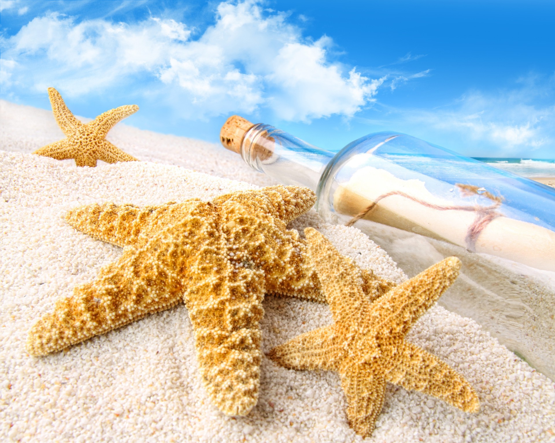 Sur la plage se trouve une étoile de mer et coquillages et une bouteille avec une lettre