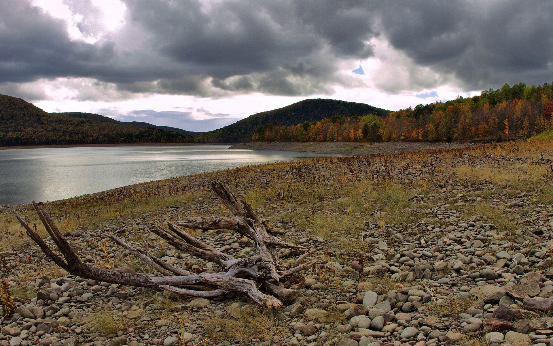 Lac par temps nuageux. Paysage de lac et d'arbres