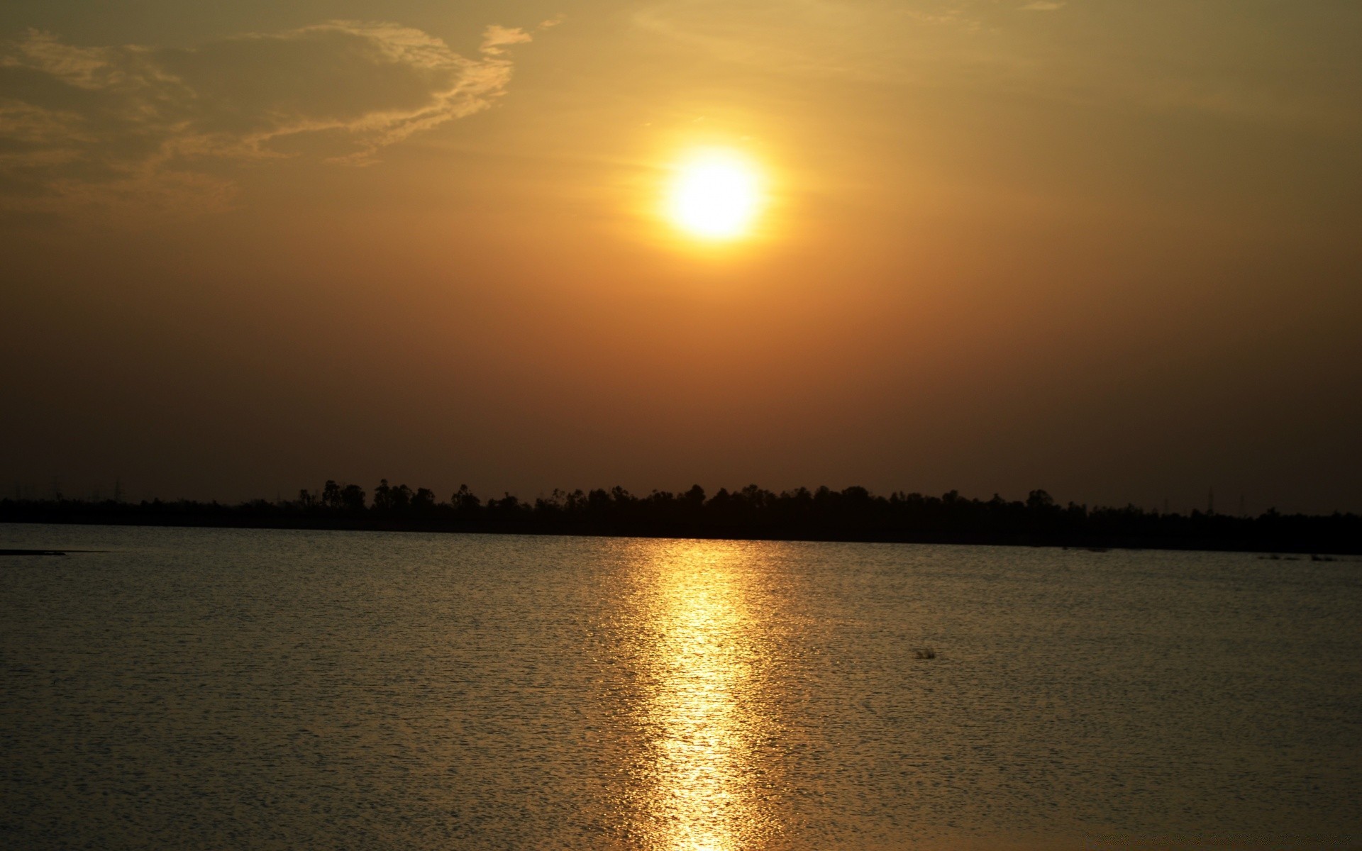 Arbre solitaire près du lac parmi les montagnes sur fond de coucher de soleil