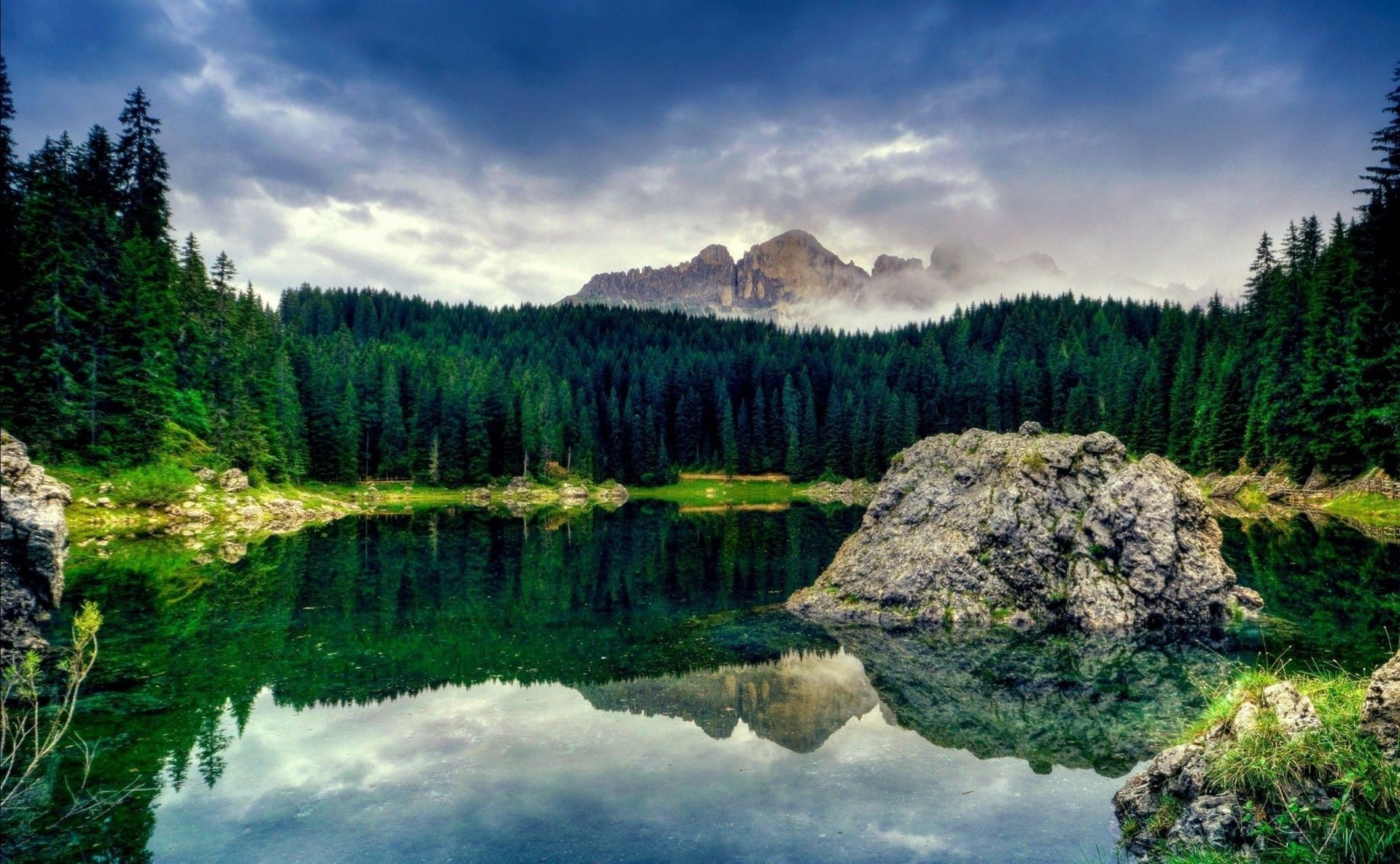 Lac de Taïga avec une belle réflexion et une pierre au centre