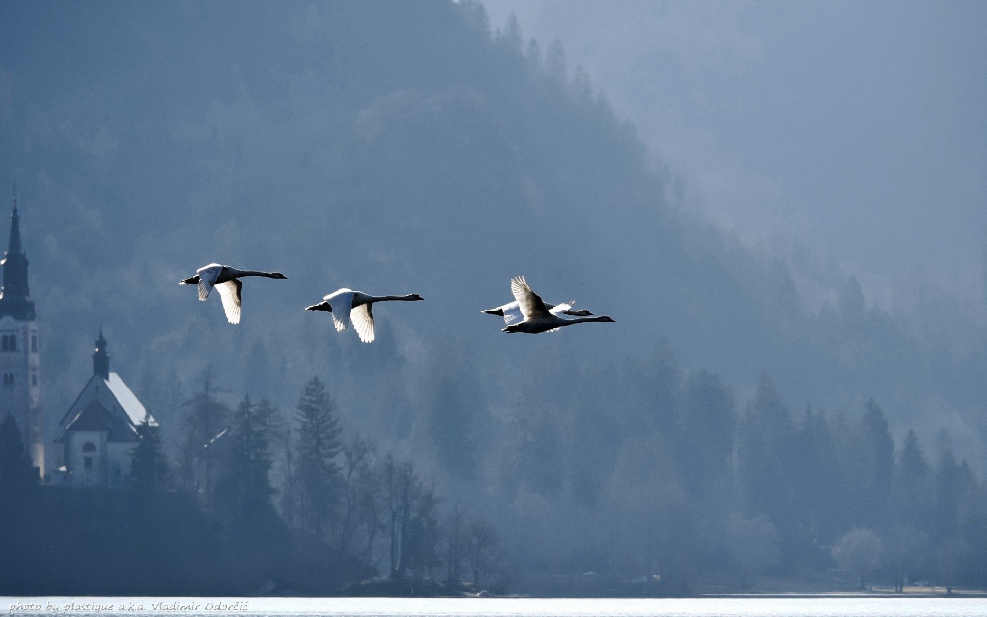 Cygnes volant au-dessus du lac sang par plastique aka Vladimir odorcic