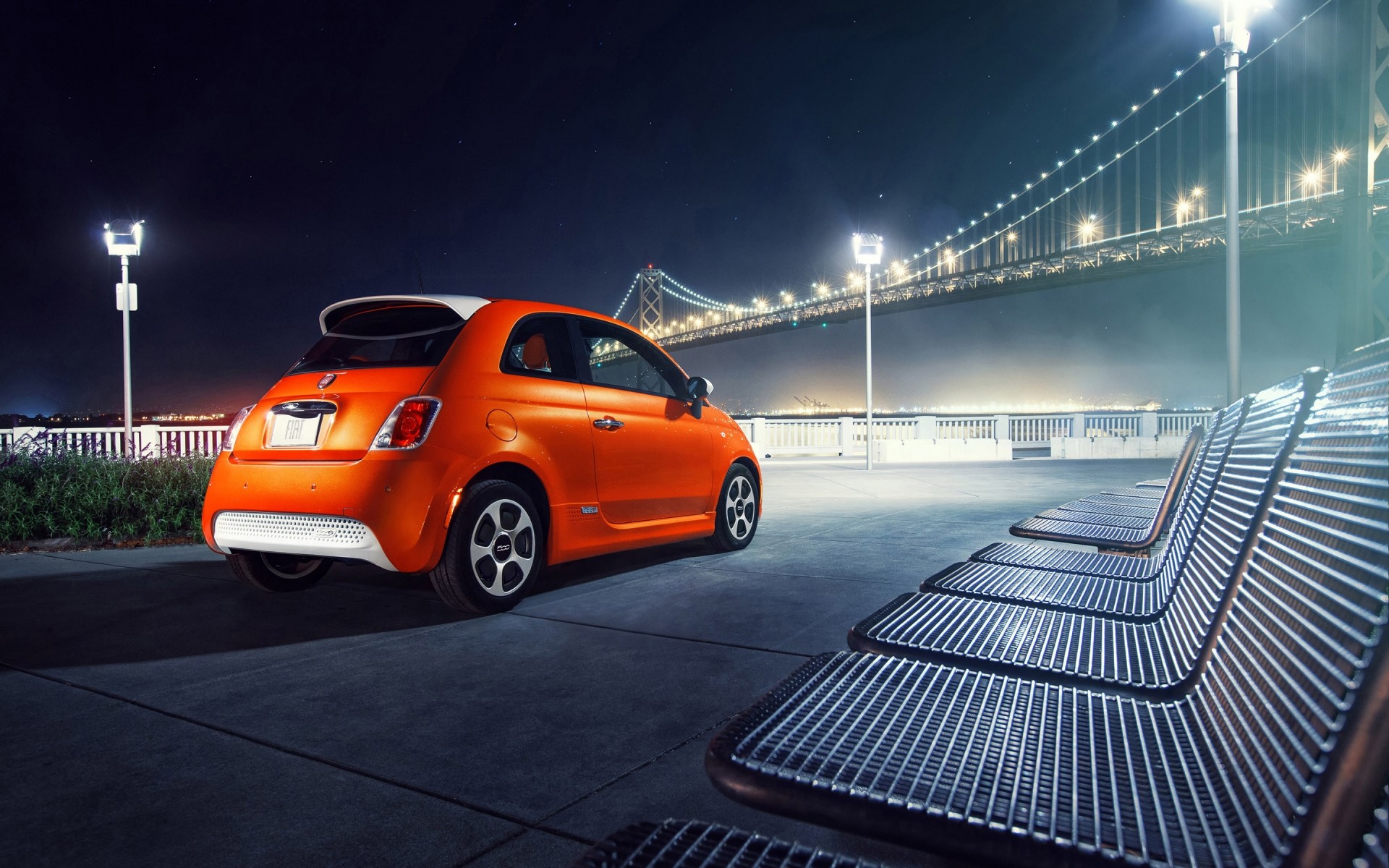 Voiture orange garée sur le front de mer avec vue sur le pontVoiture orange garée sur le front de mer avec vue sur le pont