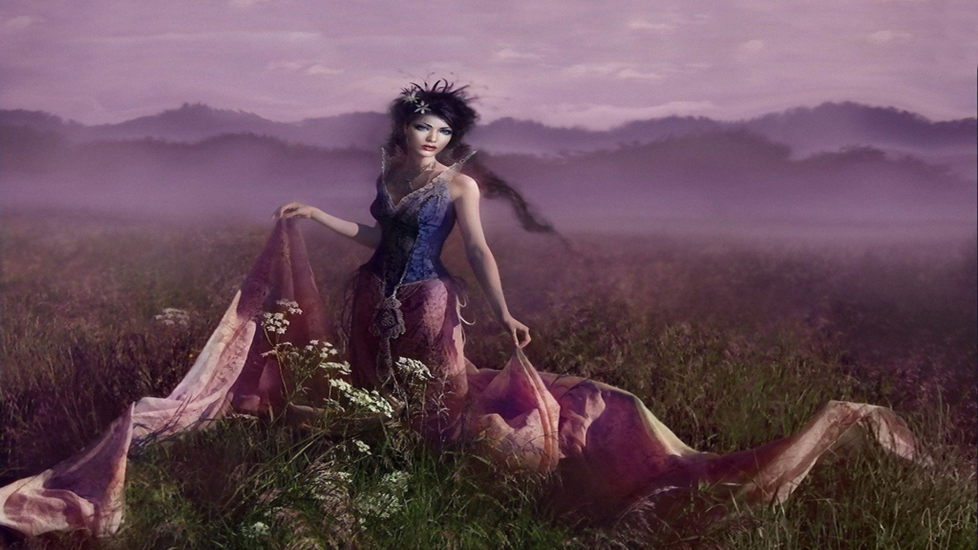 Babe en robe dans le brouillard du matin sur le terrainBabe en robe dans le brouillard du matin sur le terrain