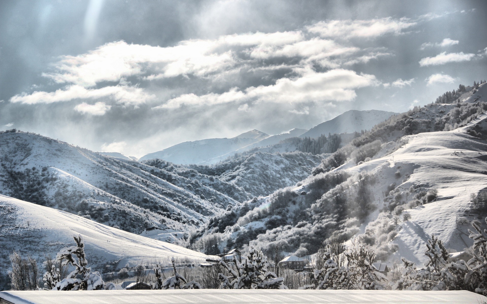 Dans le champ d'hiver et les montagnes, la neige brille au soleil