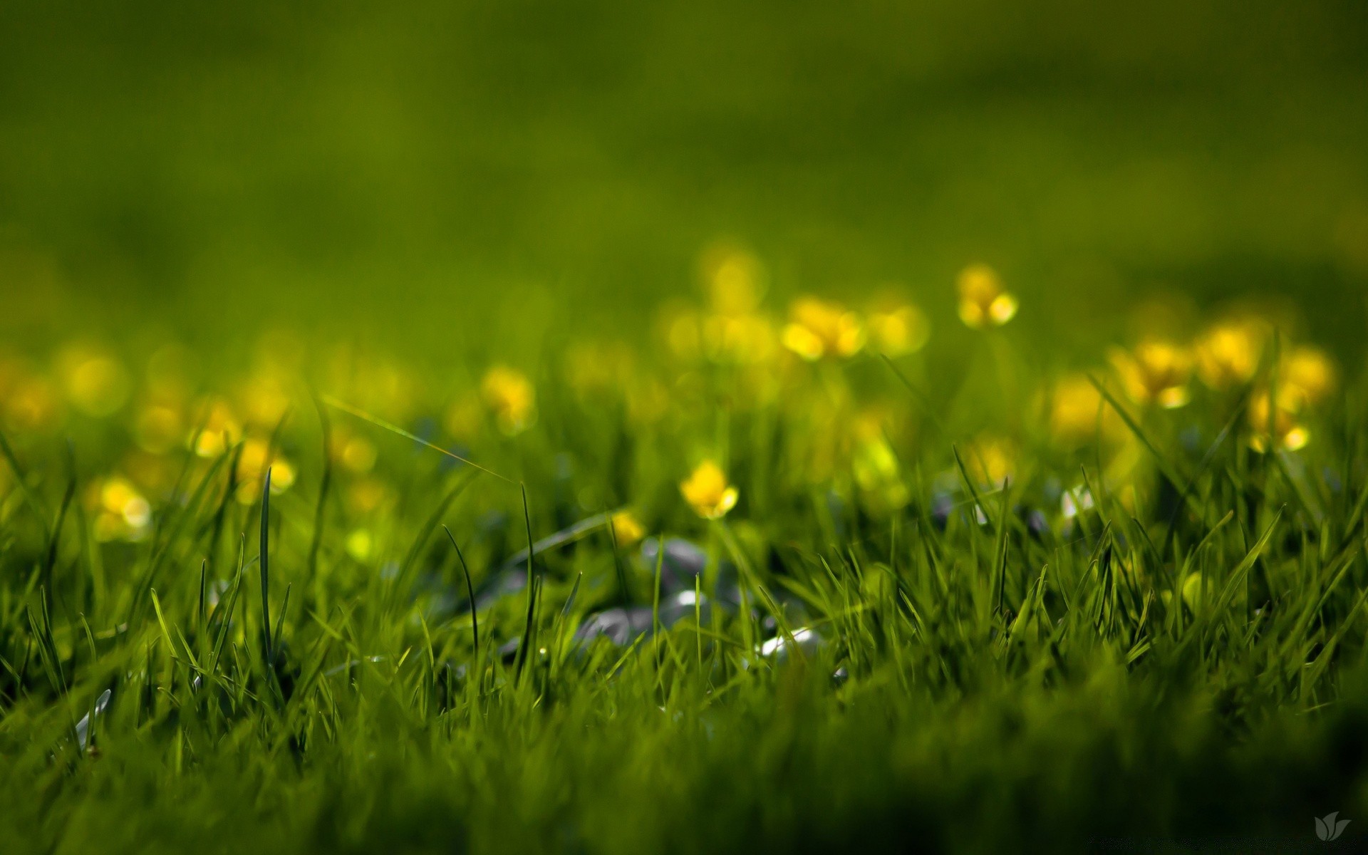 Herbe verte et petites fleurs jaunes dans le champ sous les rayons du soleil