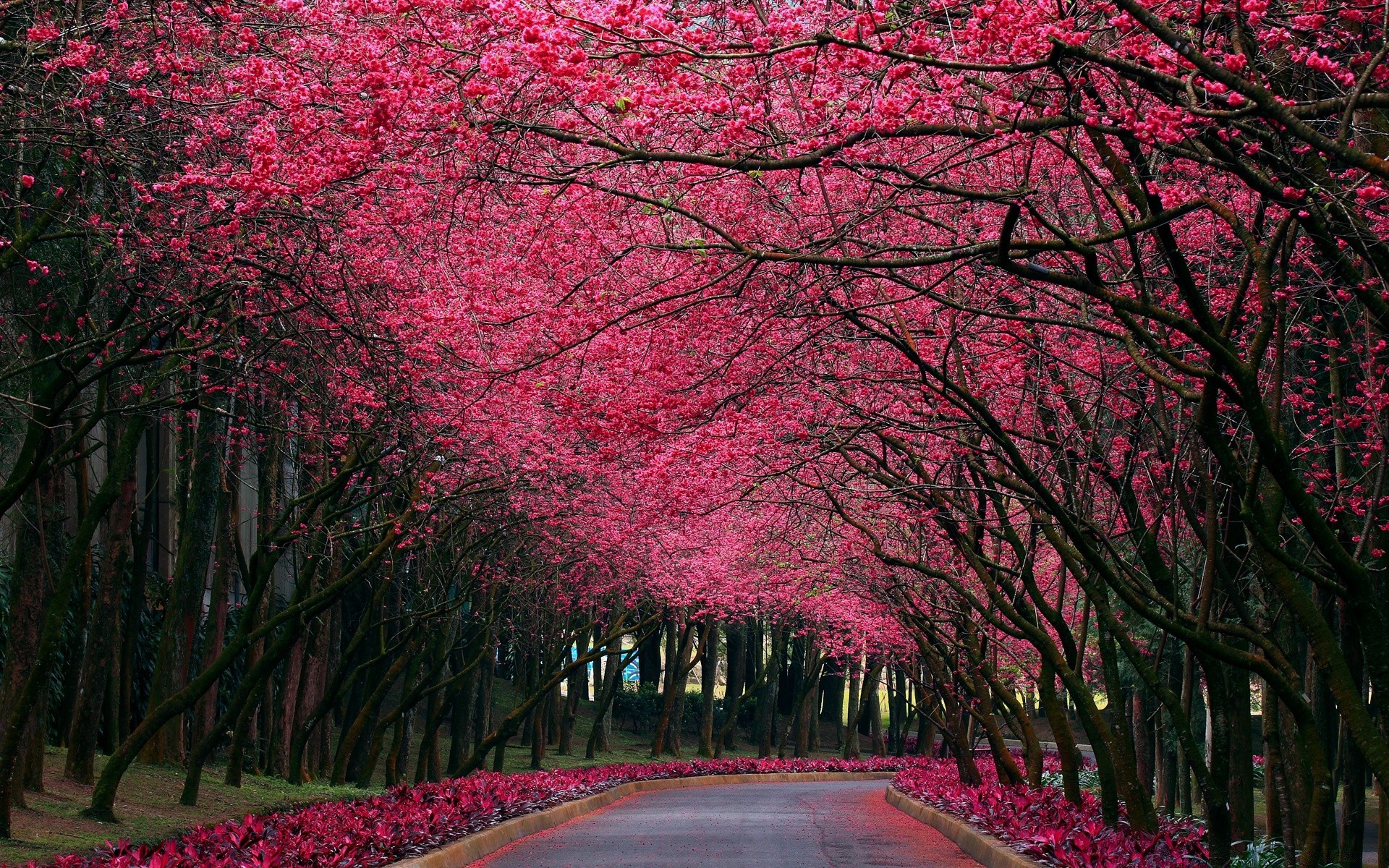 Route sous les arbres à fleurs roses