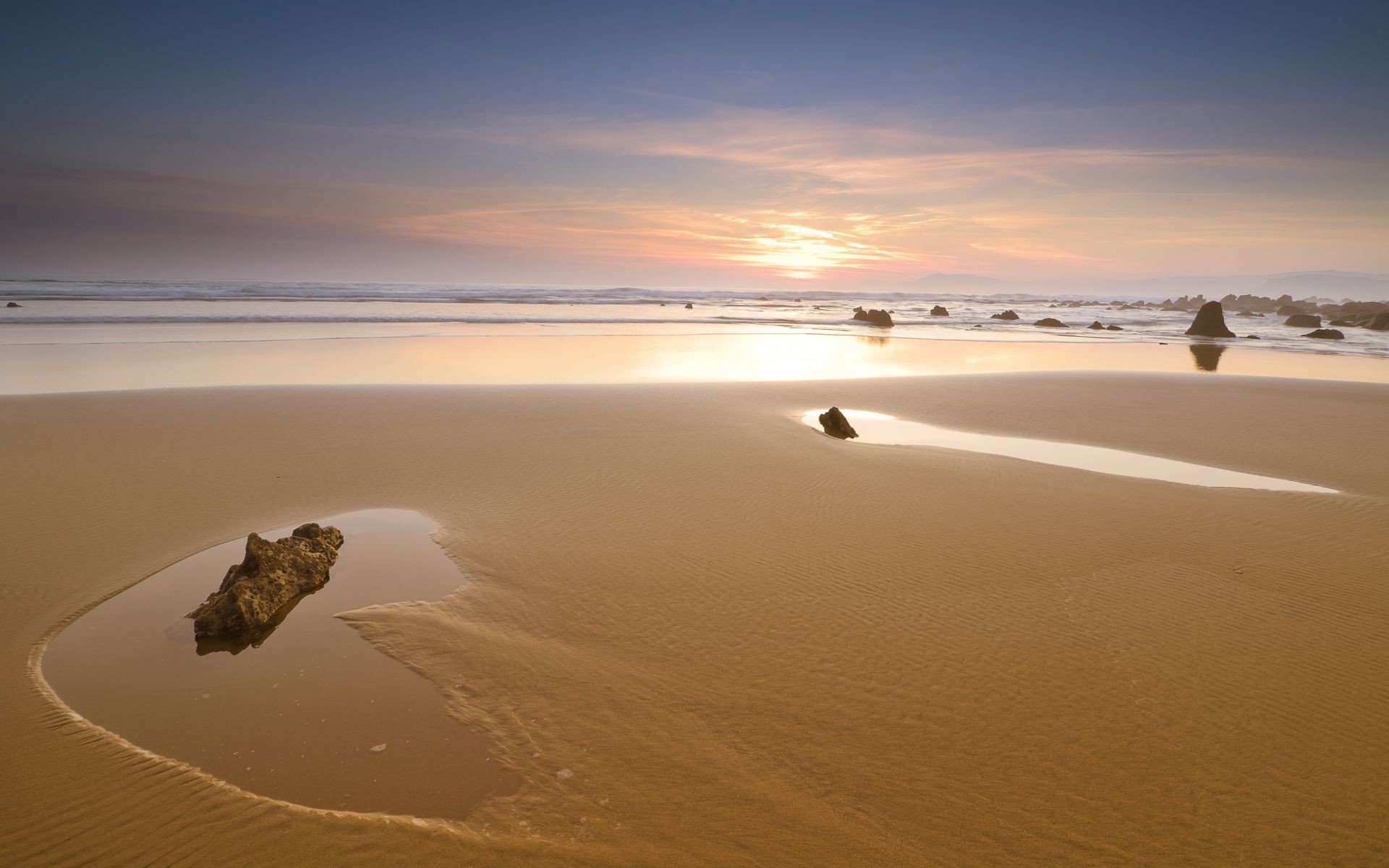 Plage de sable avec des pierres au coucher du soleilPlage de sable avec des pierres au coucher du soleil