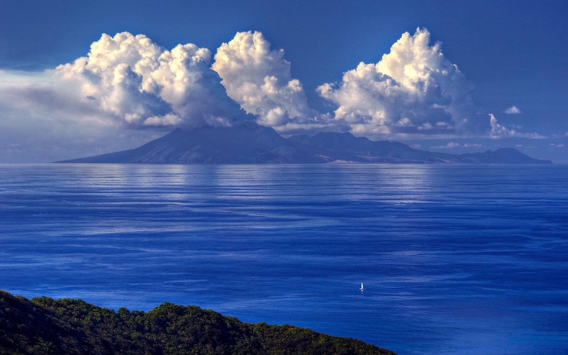 Bateau solitaire sur la surface bleue de la mer sous les nuages blancs
