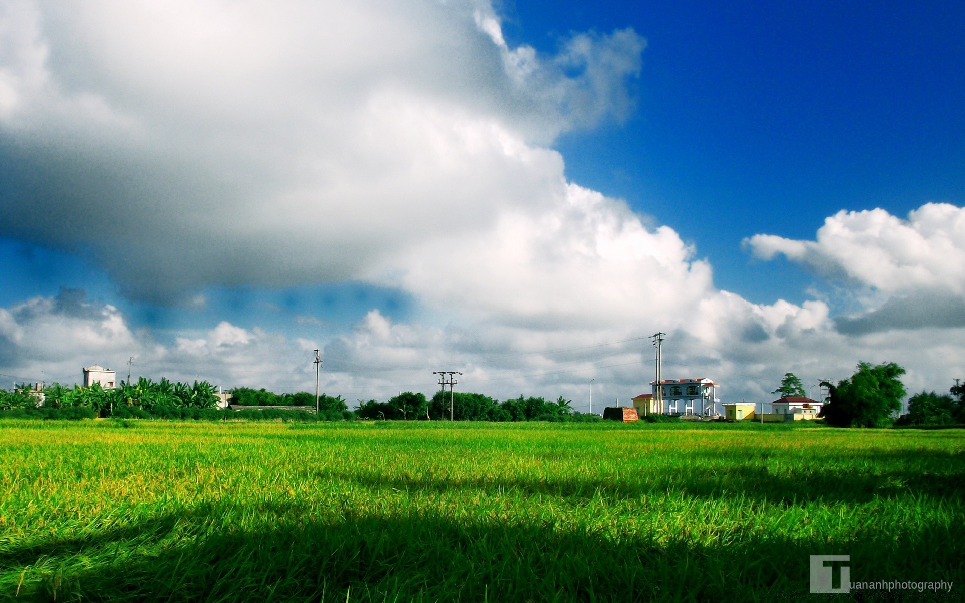 Un jeune champ de verdure avec une maison d'habitation visible au loin