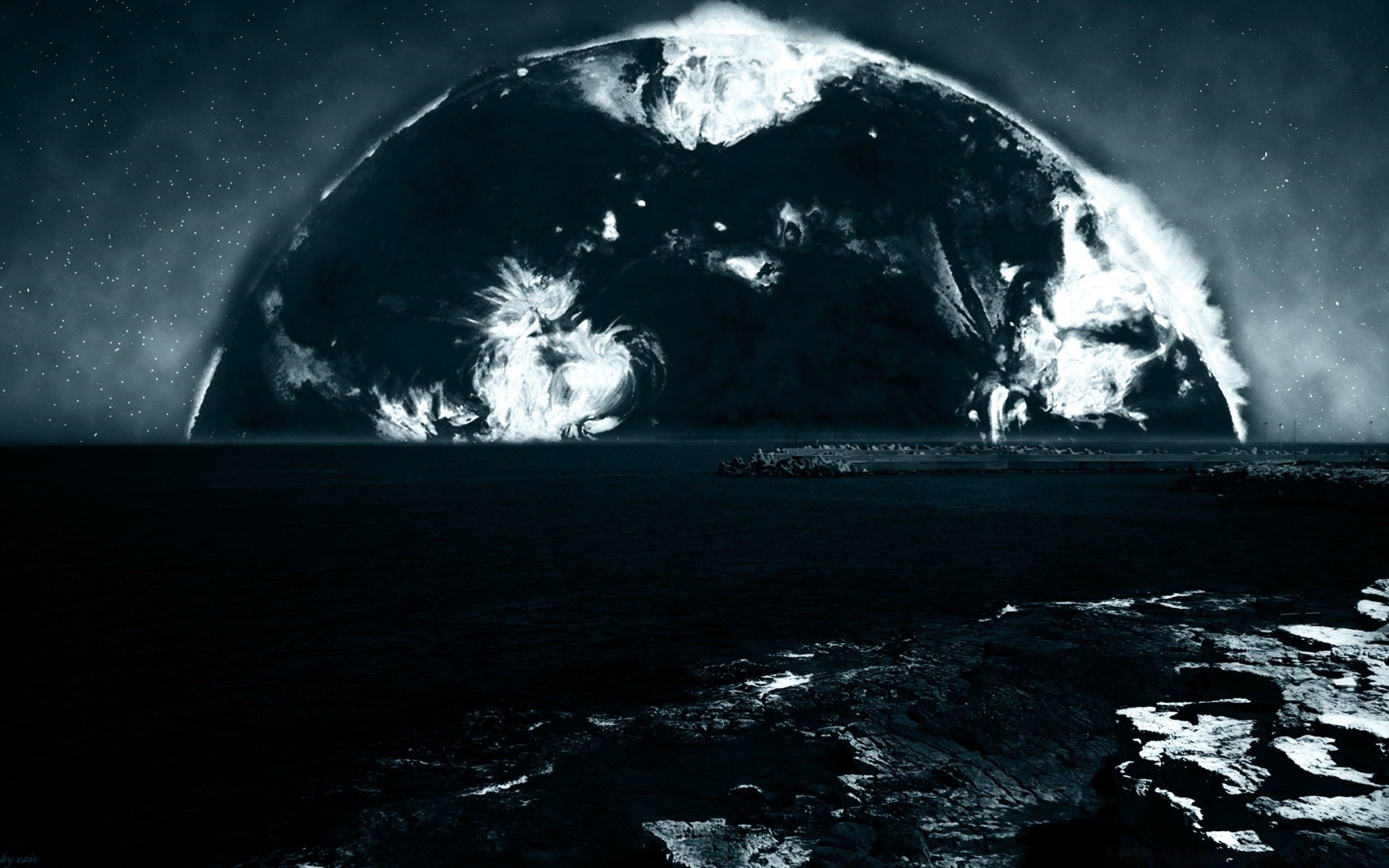Énorme Lune sur fond d'horizon et ciel étoilé sombre