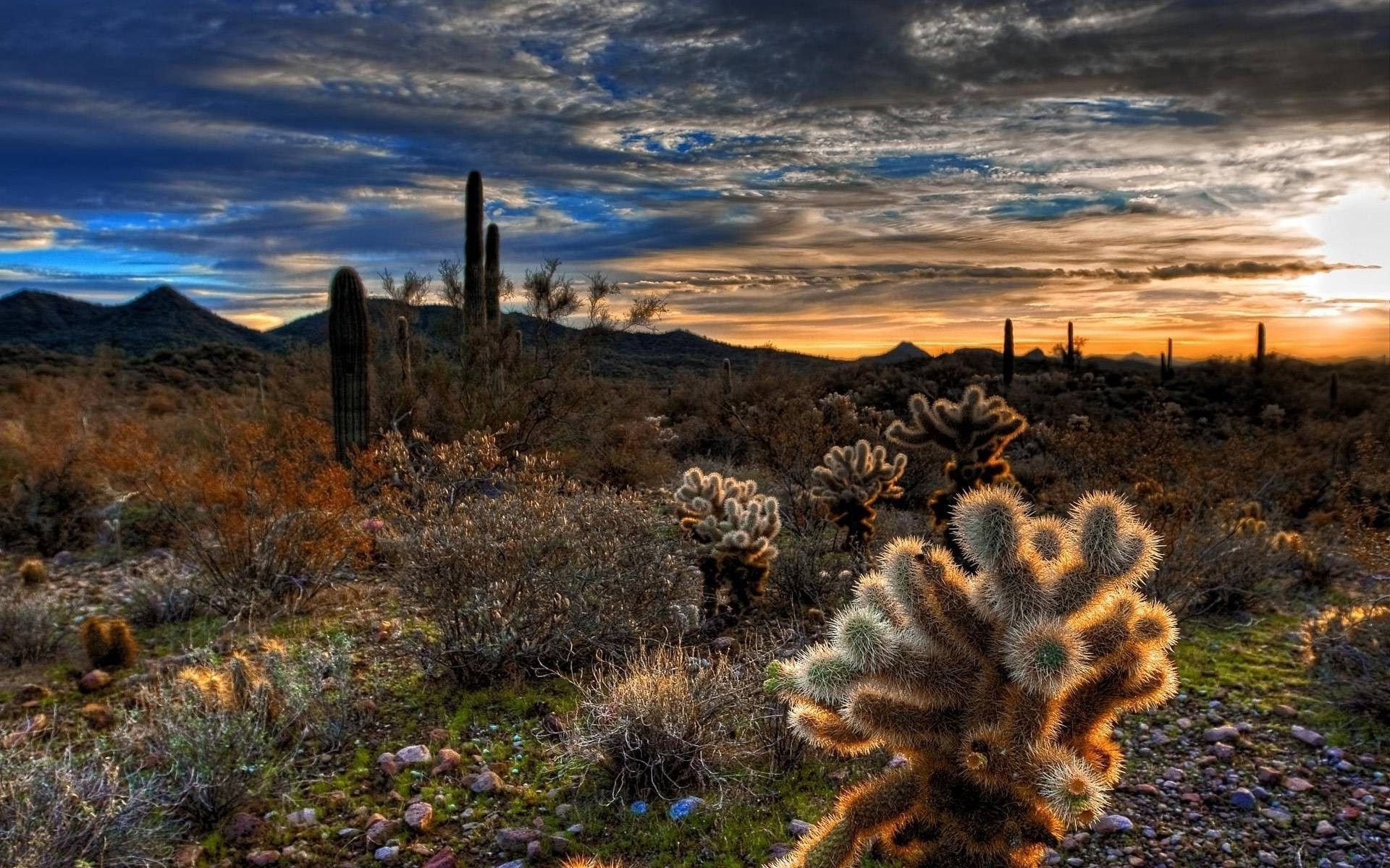 Désert avec des cactus. Coucher de soleil dans le ciel. fa