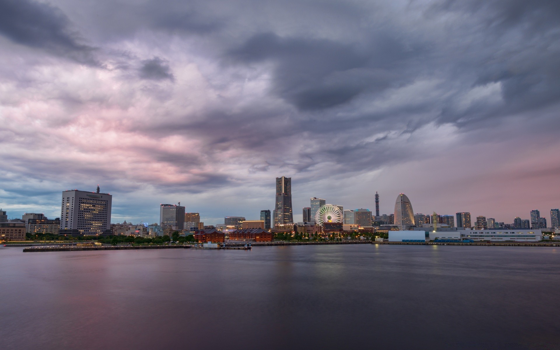 Gratte-ciel de la ville à la lumière des projecteurs bleus