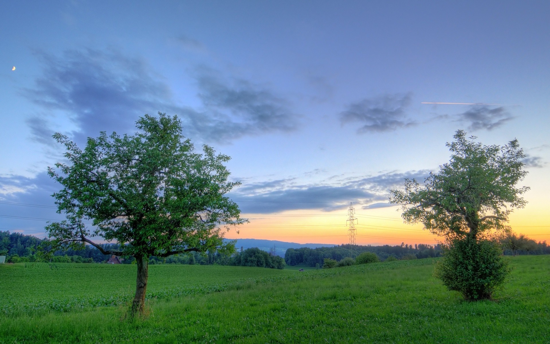 Paysage. ciel bleu. nuages dans le ciel. arbre vert. herbe vertePaysage. Ciel bleu. Nuages dans le ciel. Arbre vert. Herbe verte