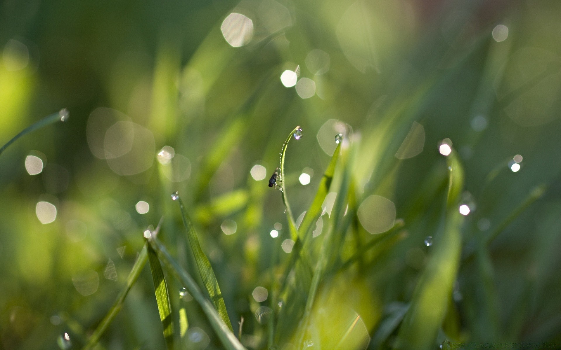 Sur l'herbe dans les gouttes de pluie se trouve un insecte