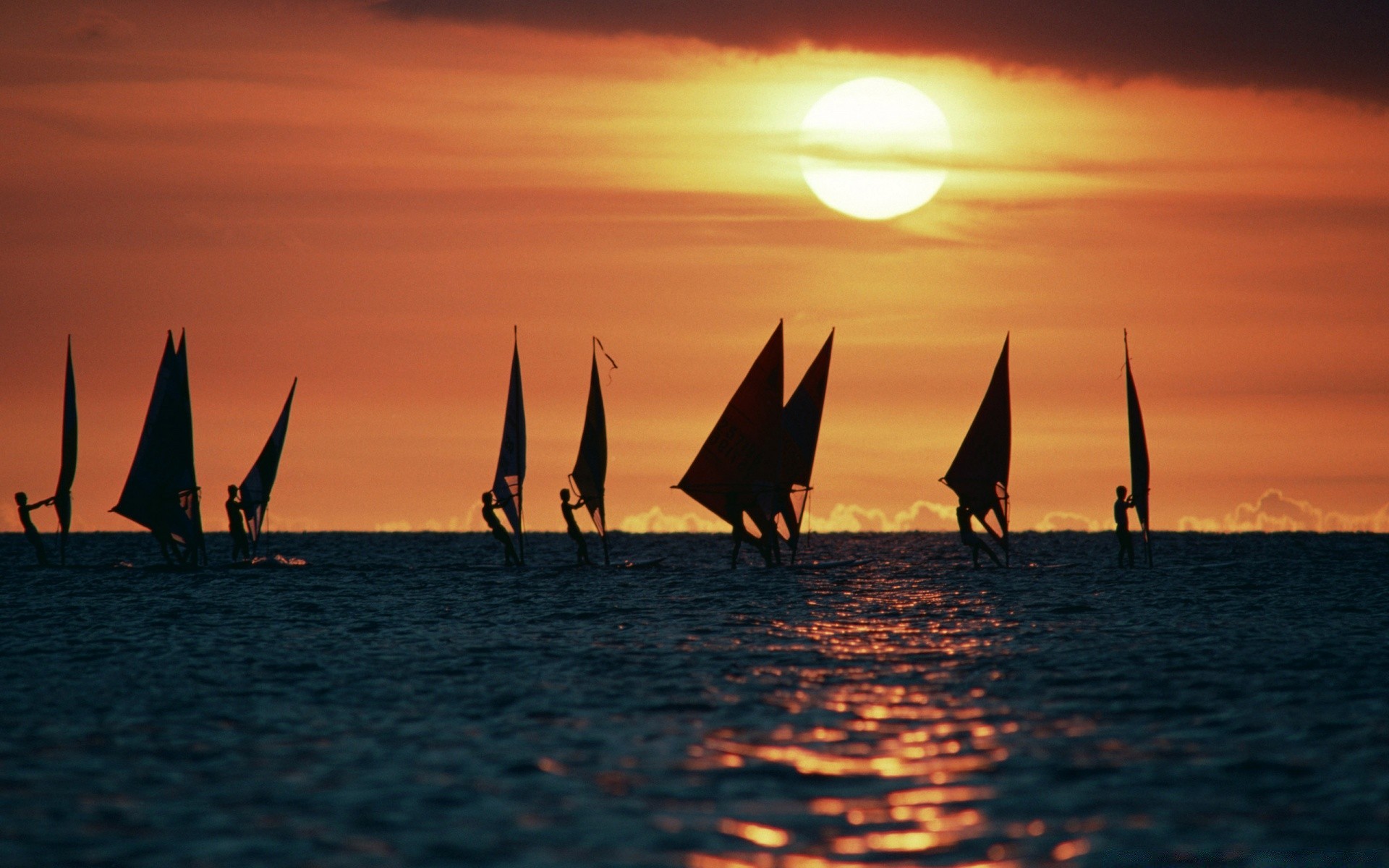 Surf avec des voiles dans la mer au coucher du soleil