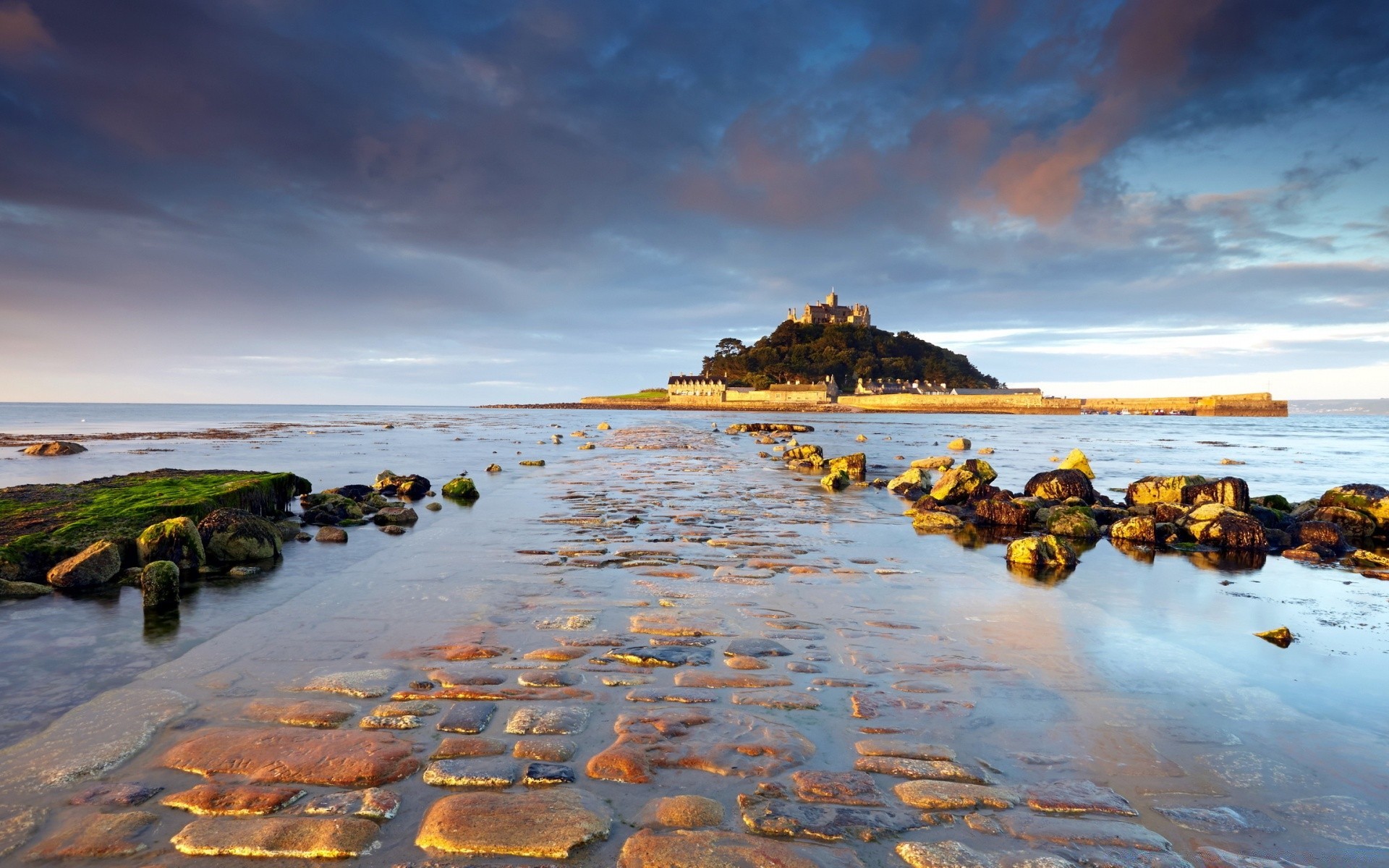 Panorama de la mer avec plage et rocher avec vue sur l'île