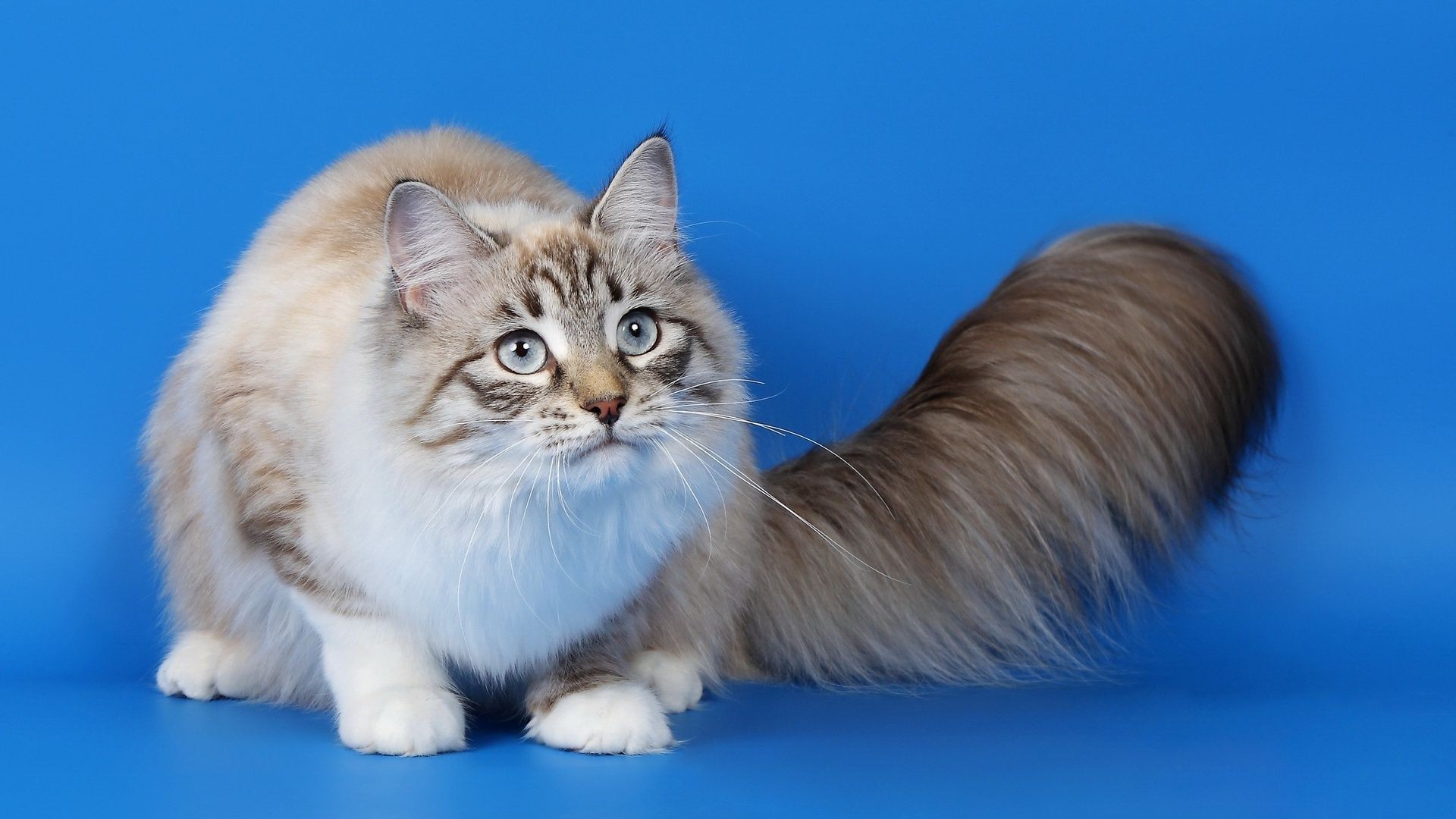 Chat moelleux sur fond bleu