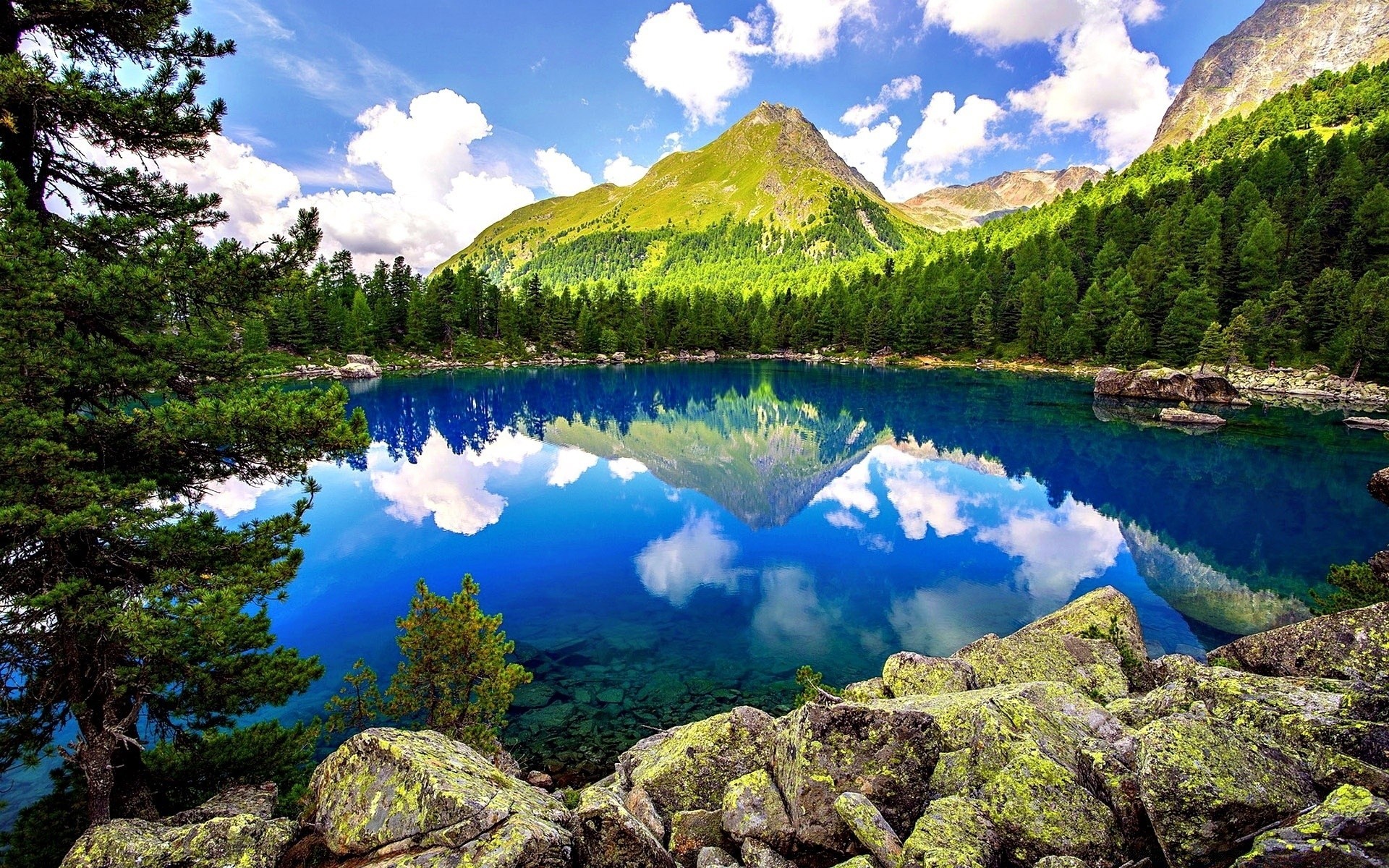 Montagne enneigée dans le ciel bleu entouré d'une forêt verte avec un lacMontagne enneigée dans le ciel bleu entouré d'une forêt verte avec un lac