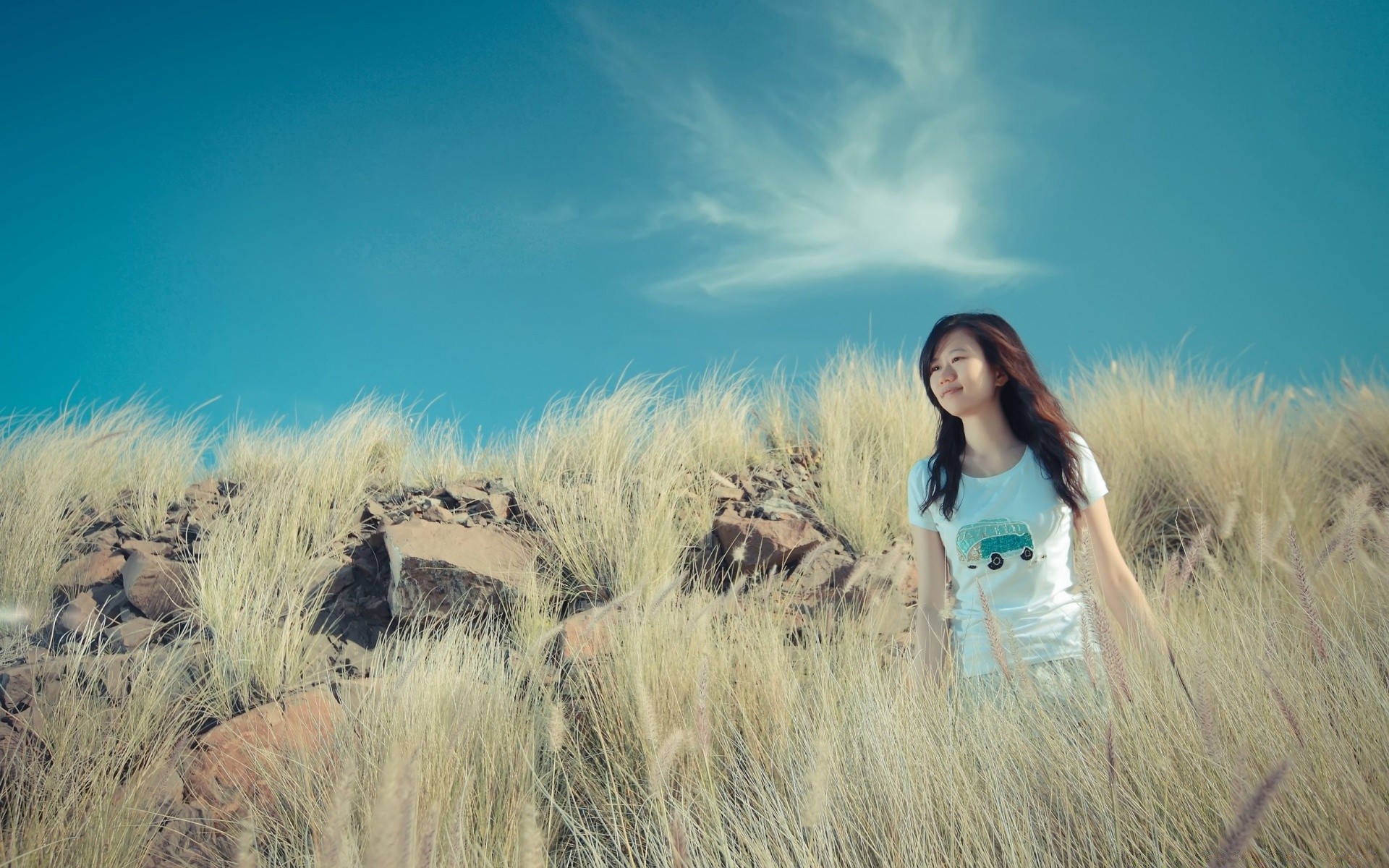 Fille sur la nature dans les montagnes de pierre dans l'herbe