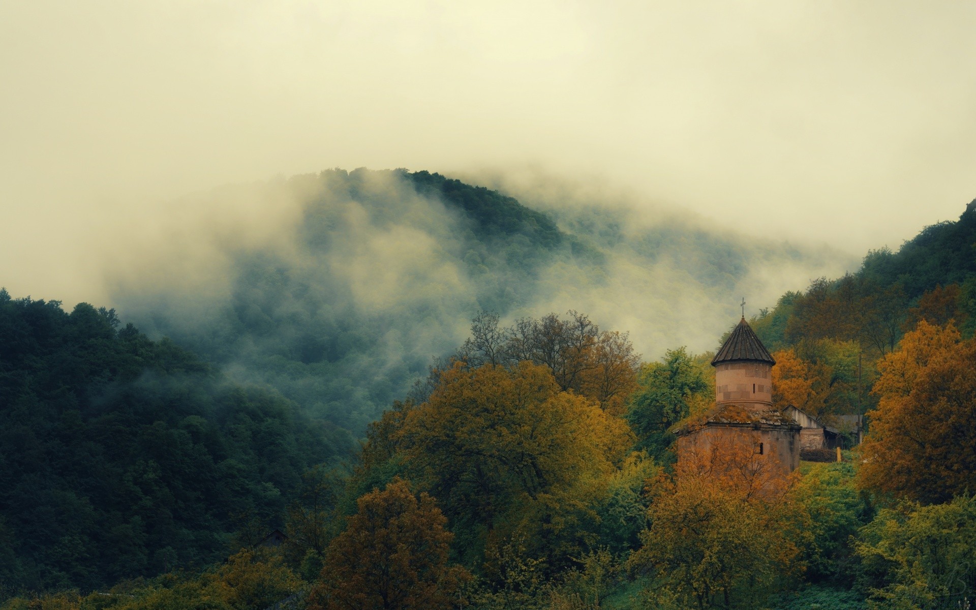 Brouillard sur les anciennes montagnes en automne
