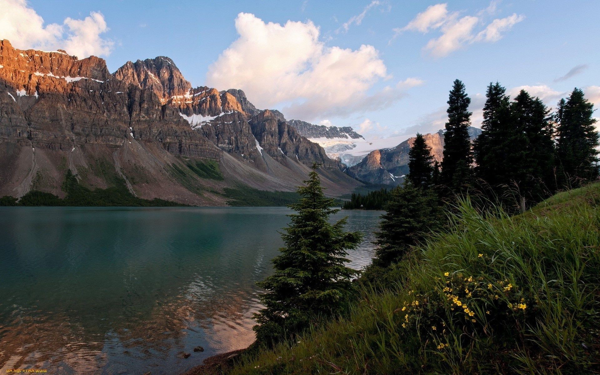 La surface miroir du lac reflète le ciel, les sommets des montagnes et les arbres