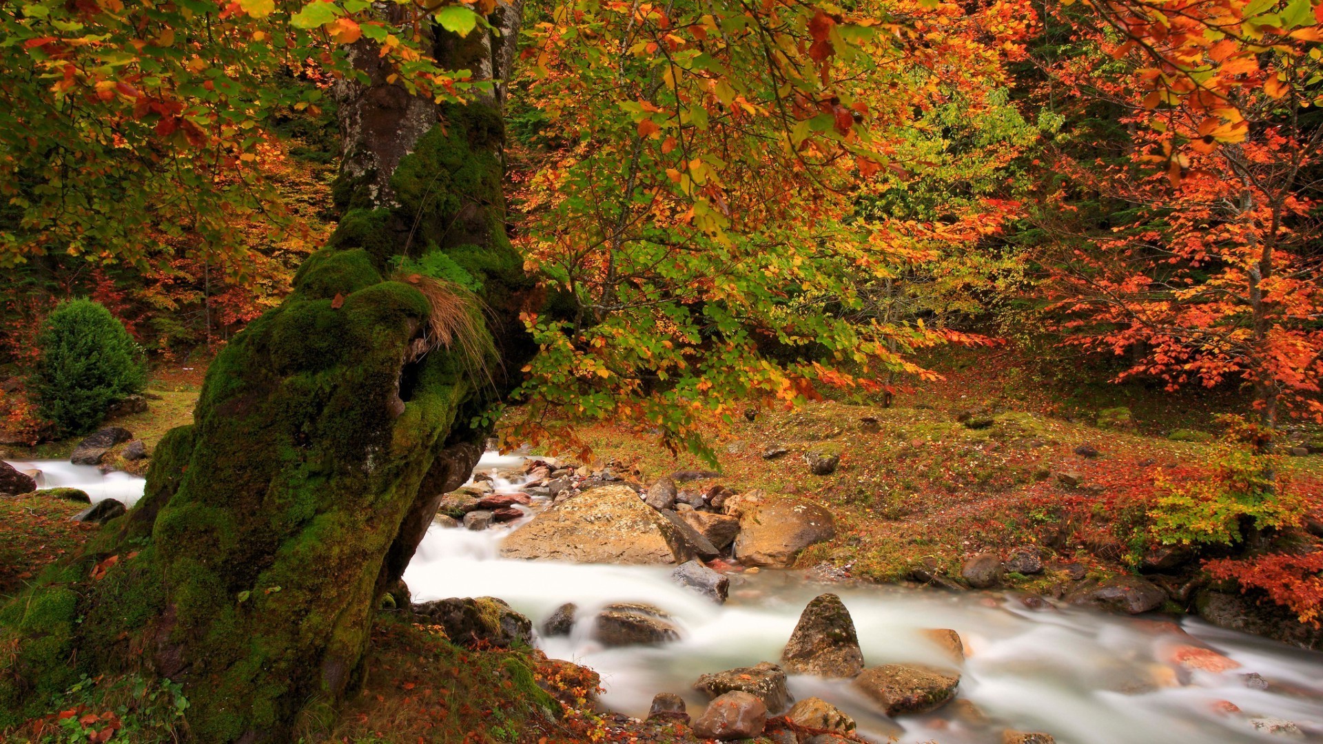Cascade se jette dans la rivière sur le fond des arbres d'automneCascade se jette dans la rivière sur le fond des arbres d'automne