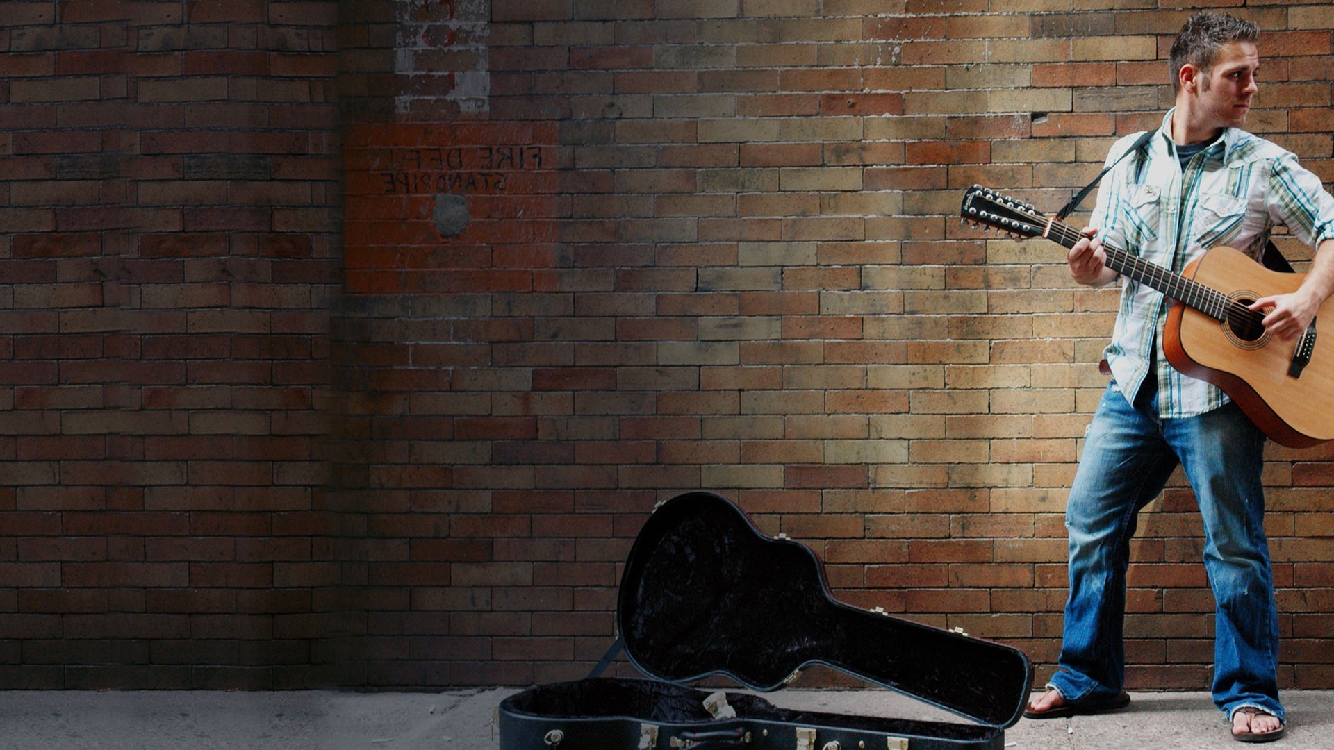 Musicien de rue joue pour les passants à la guitare, debout sur fond de mur de briques