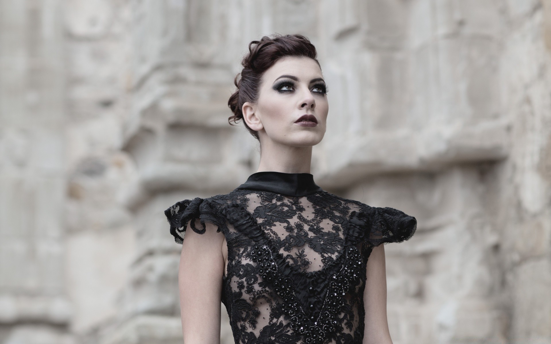 Portrait d'une jeune fille aux cheveux longs dans le style anime, dans une robe noire et coiffe