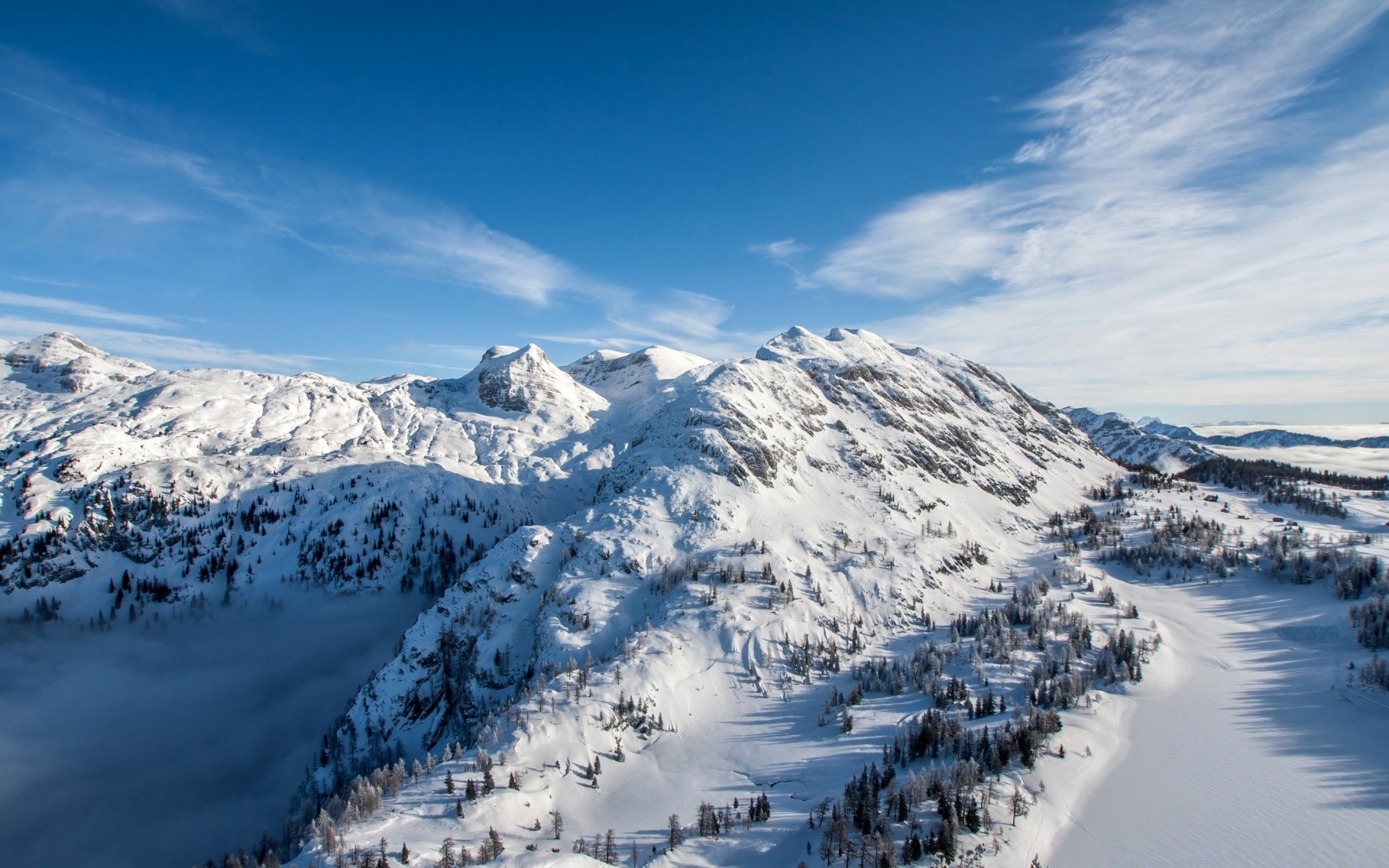 Sommets de montagne dans la neige sur fond de ciel bleu