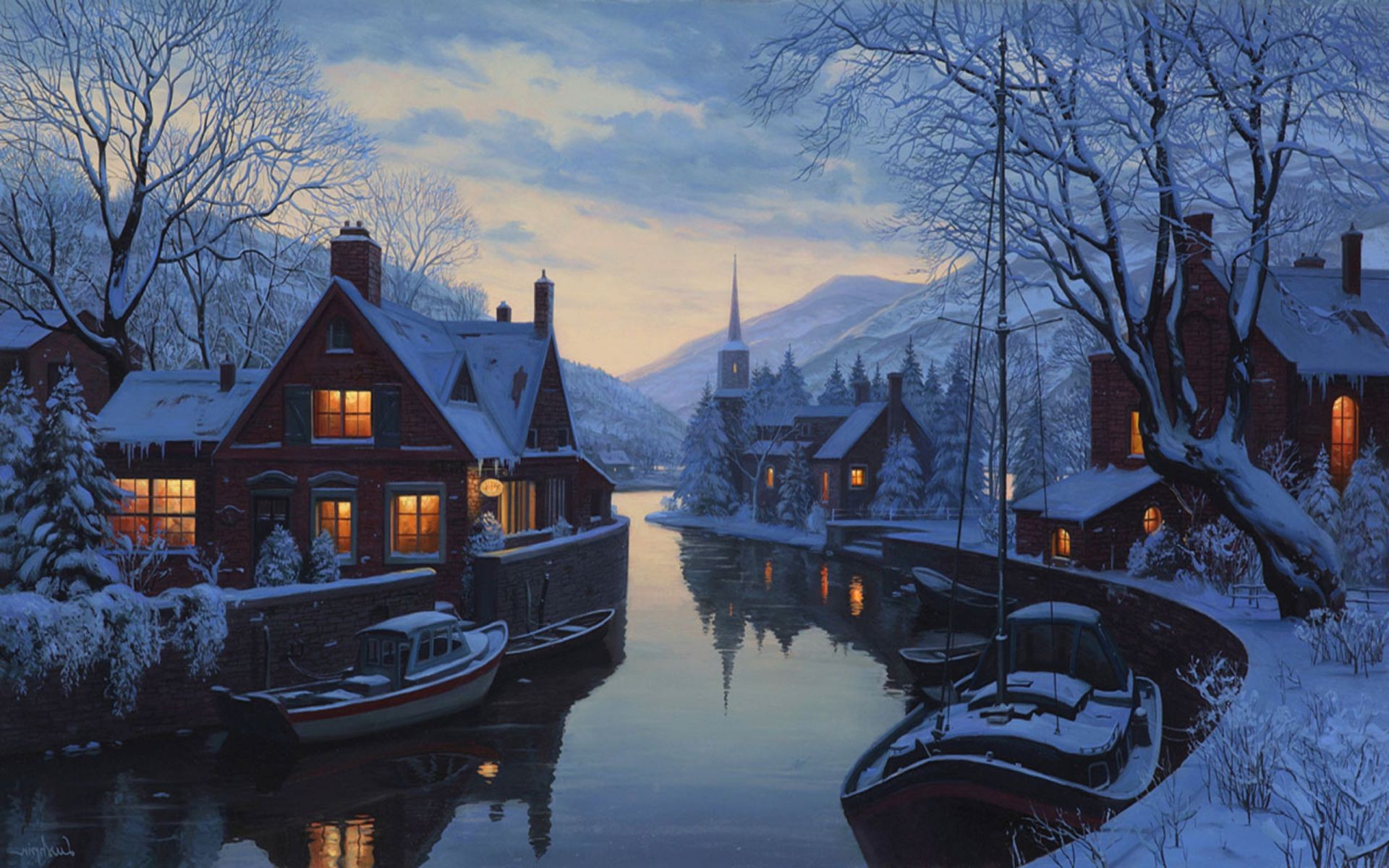 Neige. Hiver. Maisonnettes. Rivière. Beauté