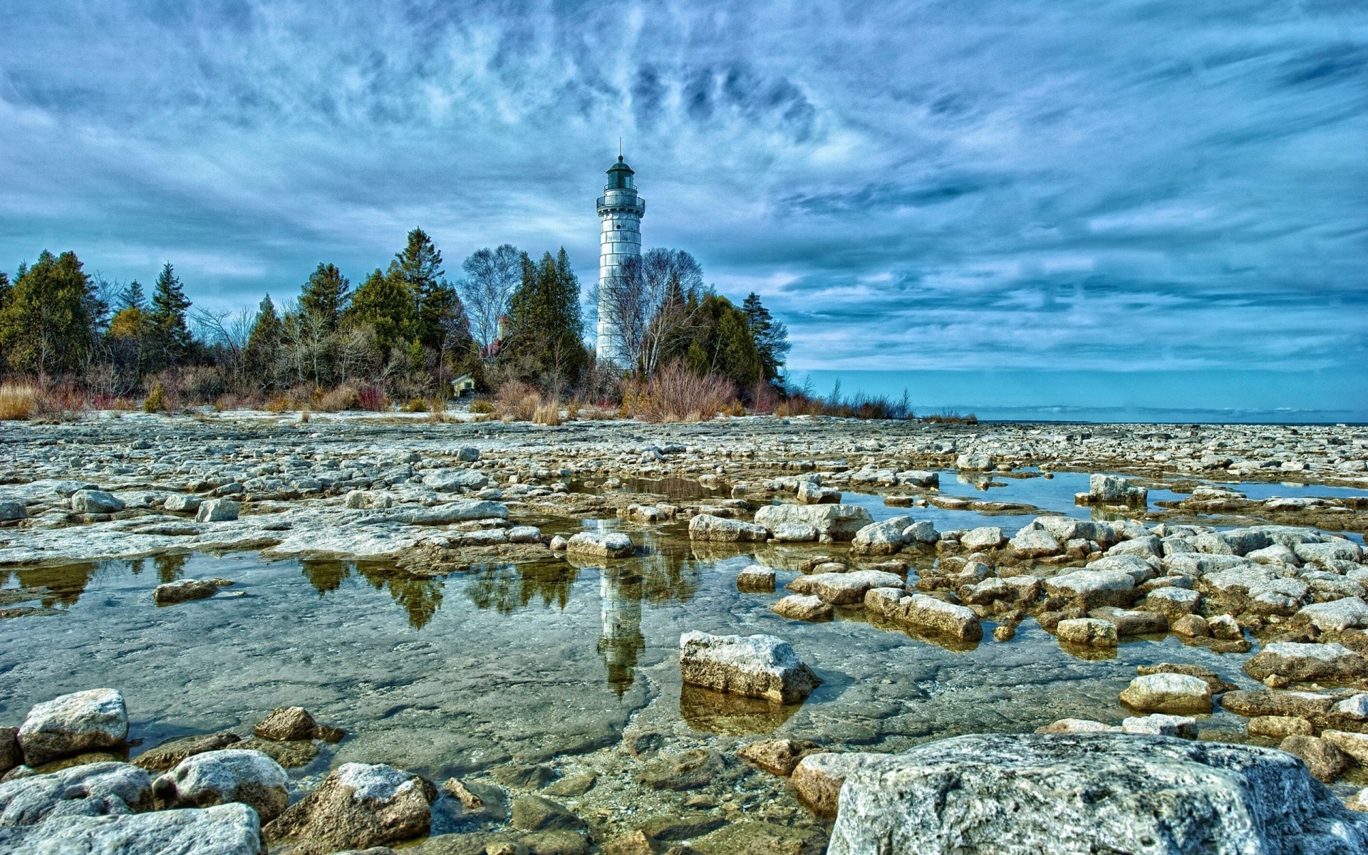 Océan. Un phare solitaire. Ciel. Nature