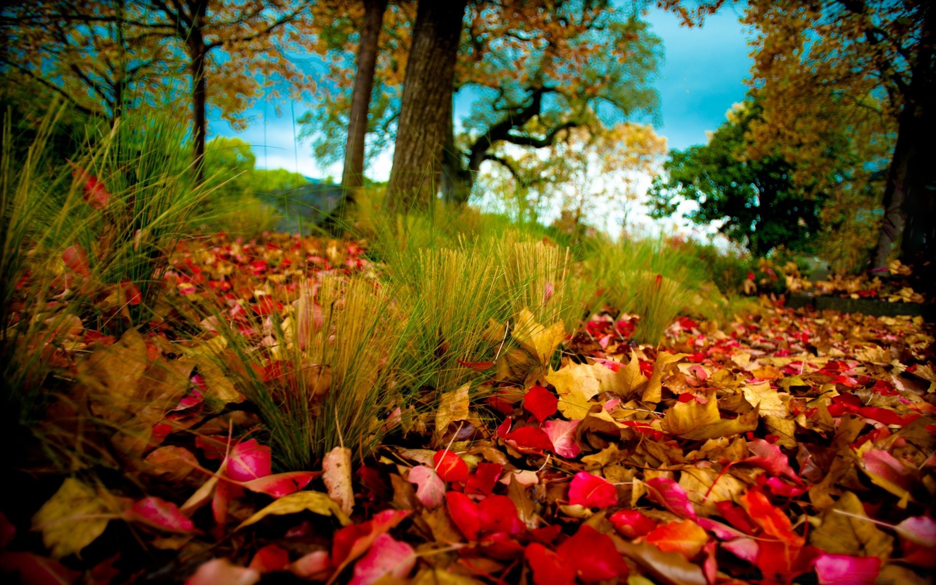 Feuilles mortes écarlates dans l'herbe verte