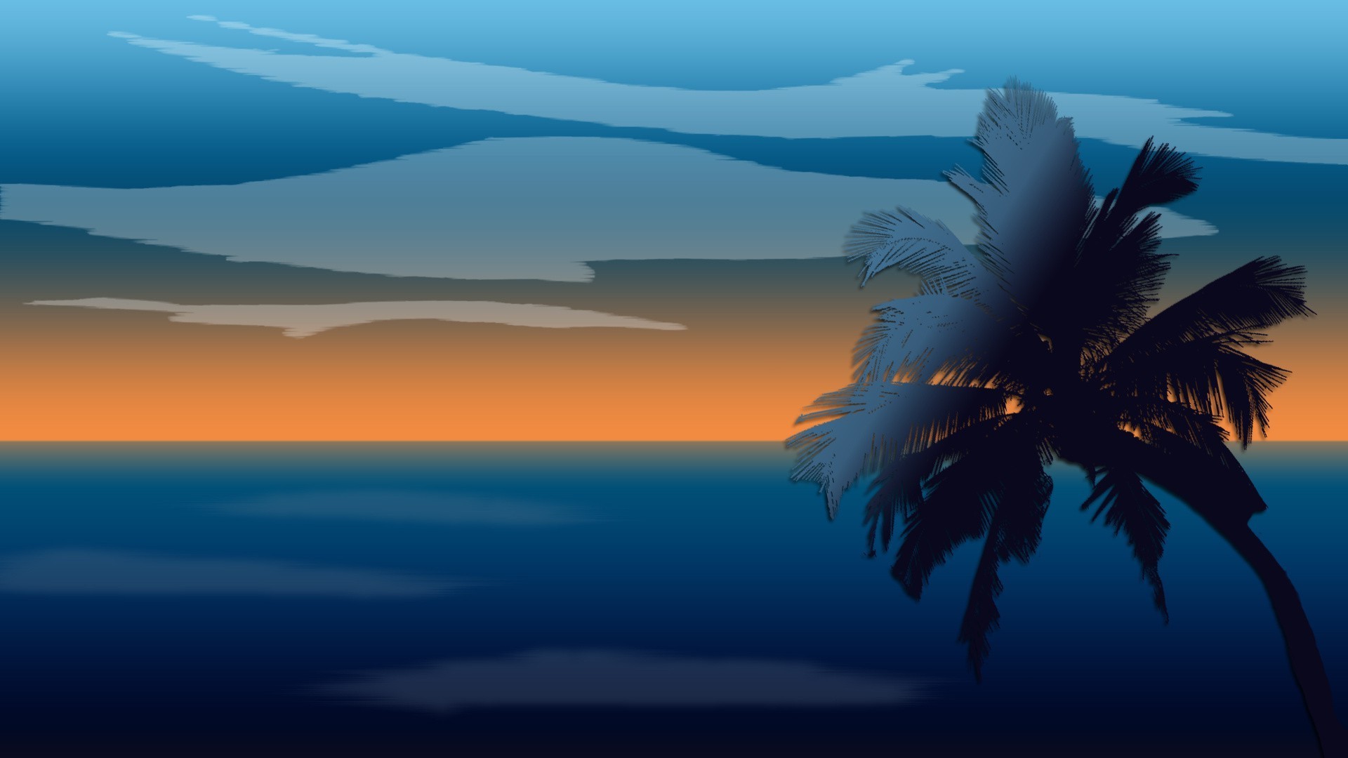 Palmier sur fond de plage et coucher de soleil dans les tons orange