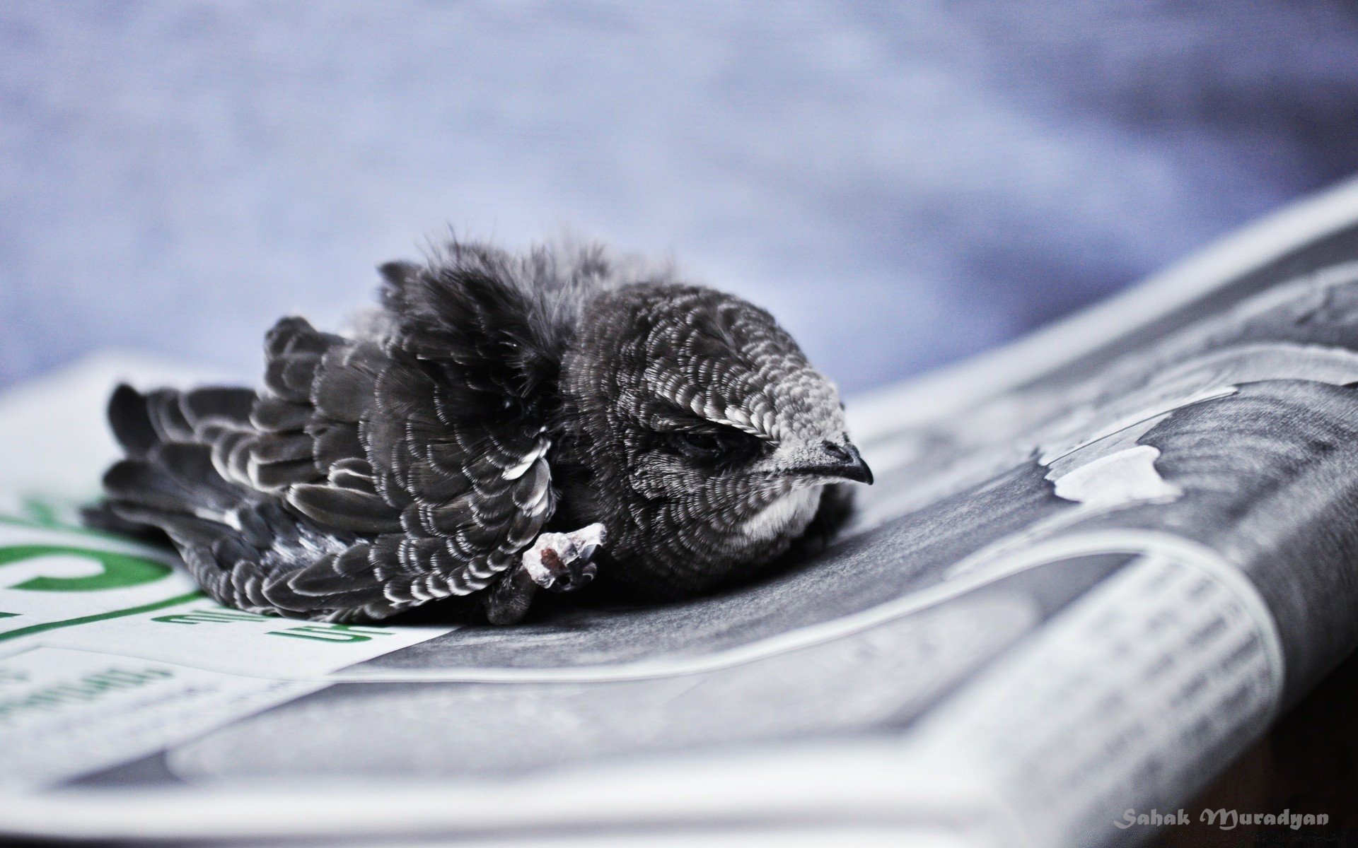 Oiseau assis sur le journal. Poussin sur papier