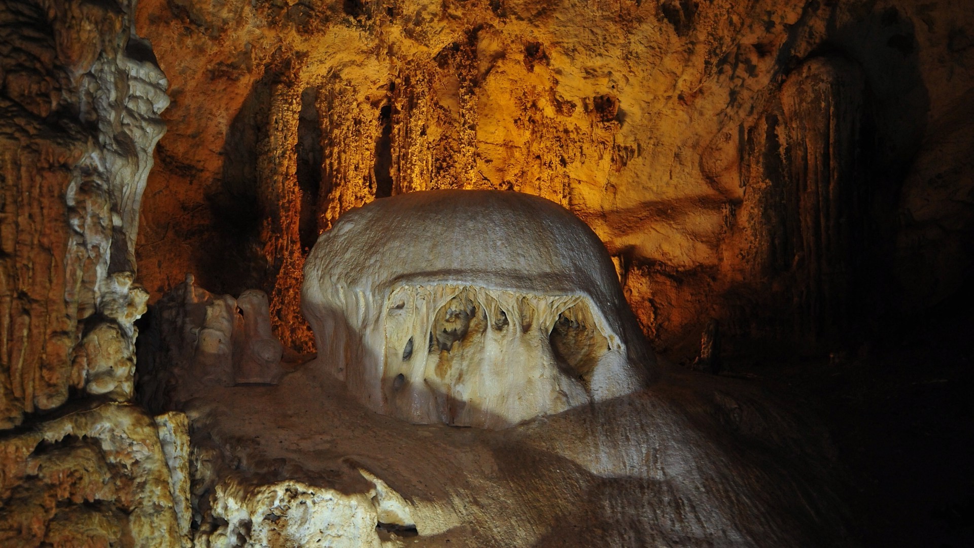 Grotte éclairée par la lumière d'en haut avec des murs bruns