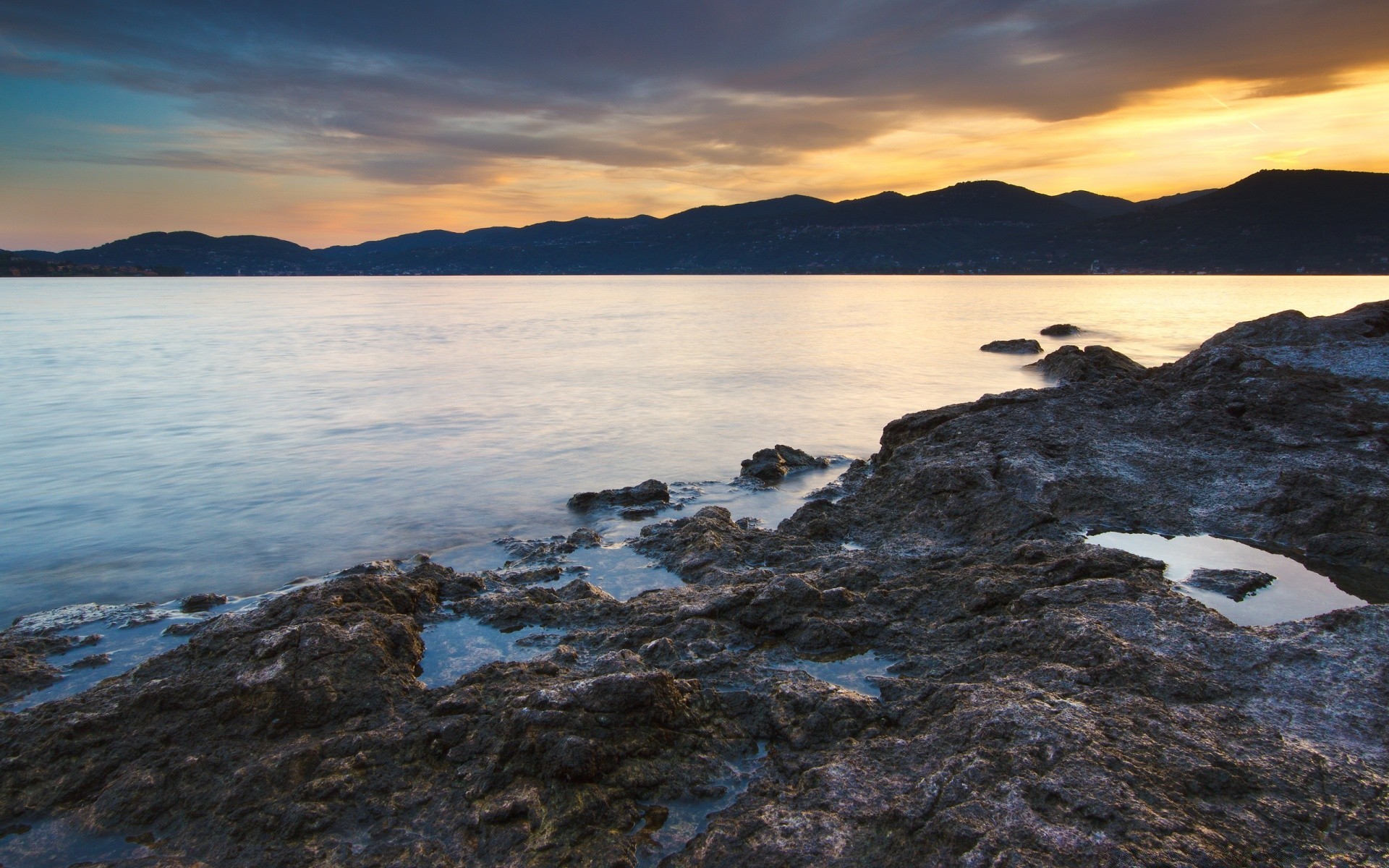 L'océan est baigné par une plage rocheuse, loin visible phareL'océan est baigné par une plage rocheuse, loin visible phare