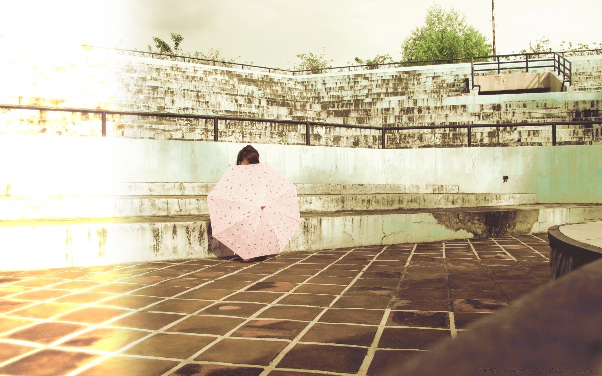 Une fille cachée derrière un parapluie dans un stade abandonnéUne fille cachée derrière un parapluie dans un stade abandonné