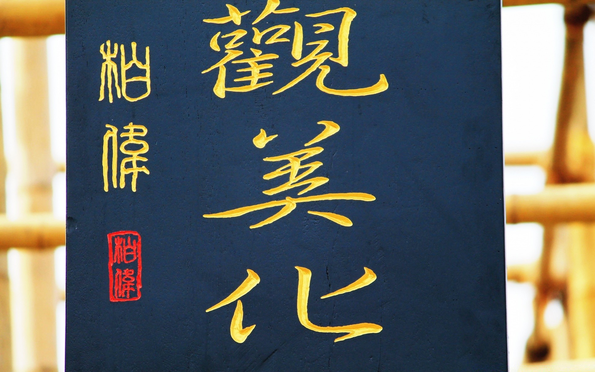 Partie d'un arbre taillé sur un fond de ciel avec des inscriptions